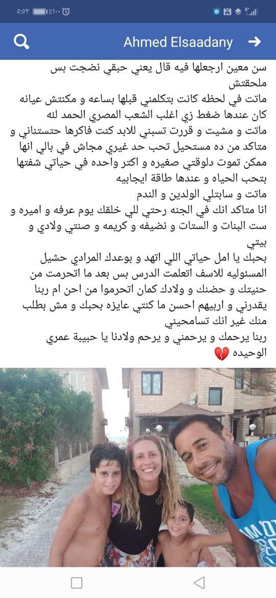 واختتم: "ماتت في لحظه كانت بتكلمني قبلها بساعه ومكنتش عيانه كان عندها ضغط زي اغلب الشعب المصري الحمد لله، ماتت ومشيت وقررت تسبني للابد كنت فاكرها حتستناني ومتأكد من ده مستحيل تحب حد غيري مجاش في بالي انها ممكن تموت دلوقتي صغيره واكتر واحده في حياتي شفتها بتحب الحياه و عندها طاقة ايجابية، ماتت وسابتلي الولدين والندم انا متاكد انك في الجنة رحتي للي خلقك يوم عرفه واميرة وست البنات والستات ونضيفة وكريمة وصنتي ولادي وبيتي.. بحبك يا أمل حياتي اللي اتهد و بوعدك المرادي حشيل المسئولية للأسف اتعلمت الدرس بس بعد ما اتحرمت من حنيتك و حضنك و ولادك كمان اتحرموا من أحن أم ربنا يقدرني و اربيهم أحسن ما كنتي عايزه بحبك و مش بطلب منك غير انك تسامحيني.. ربنا يرحمك و يرحمني و يرحم ولادنا يا حبيبة عمري الوحيدة".