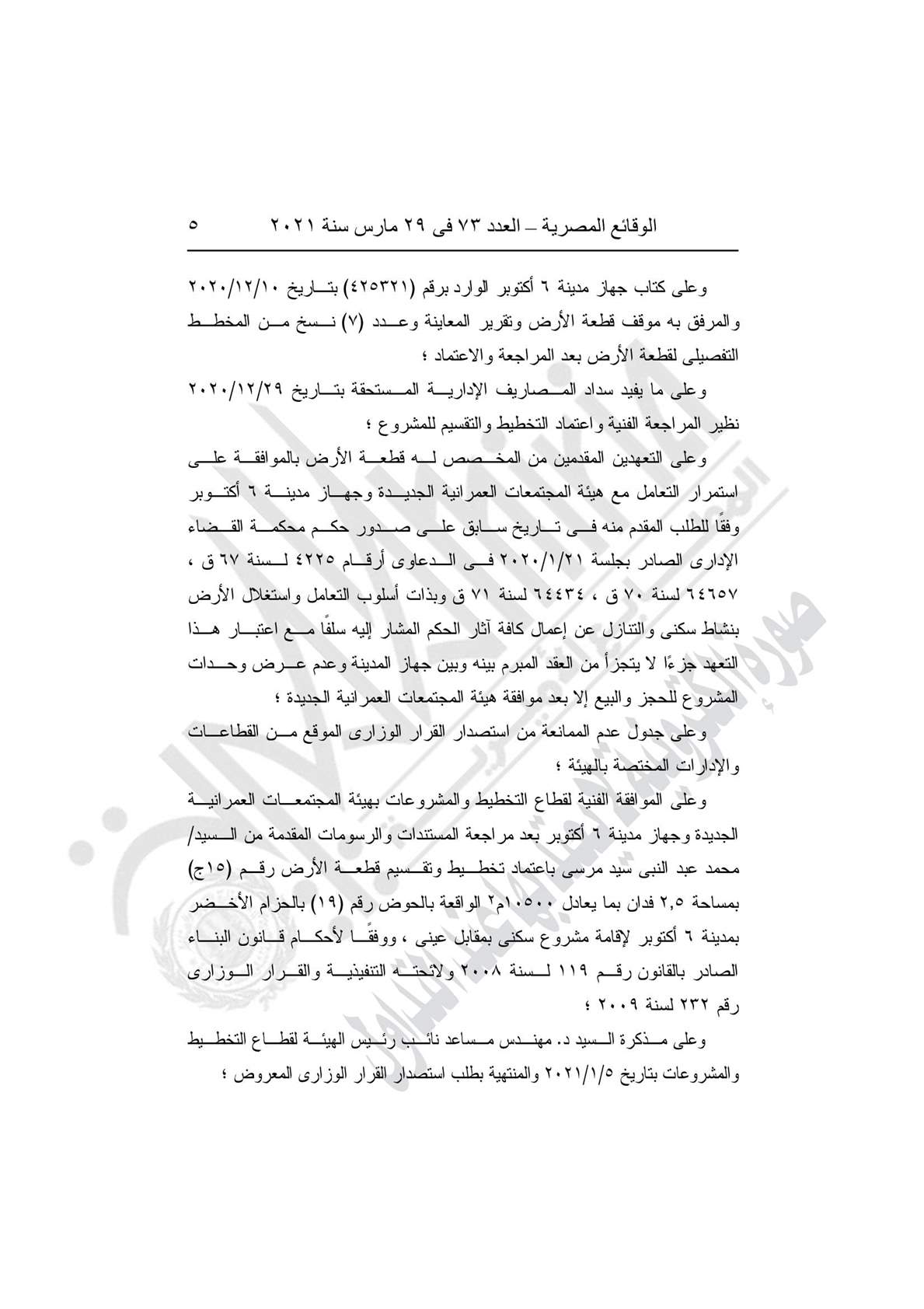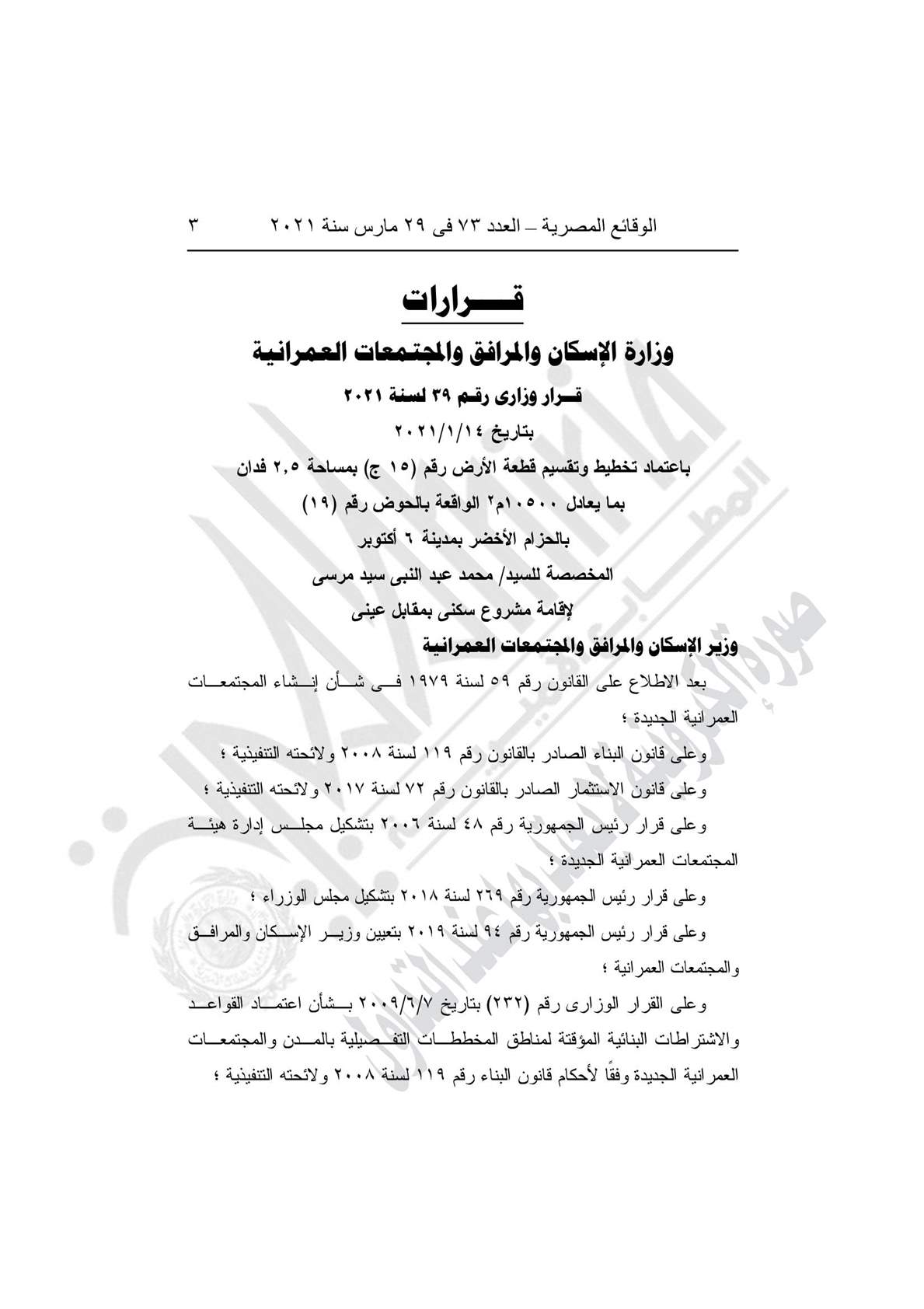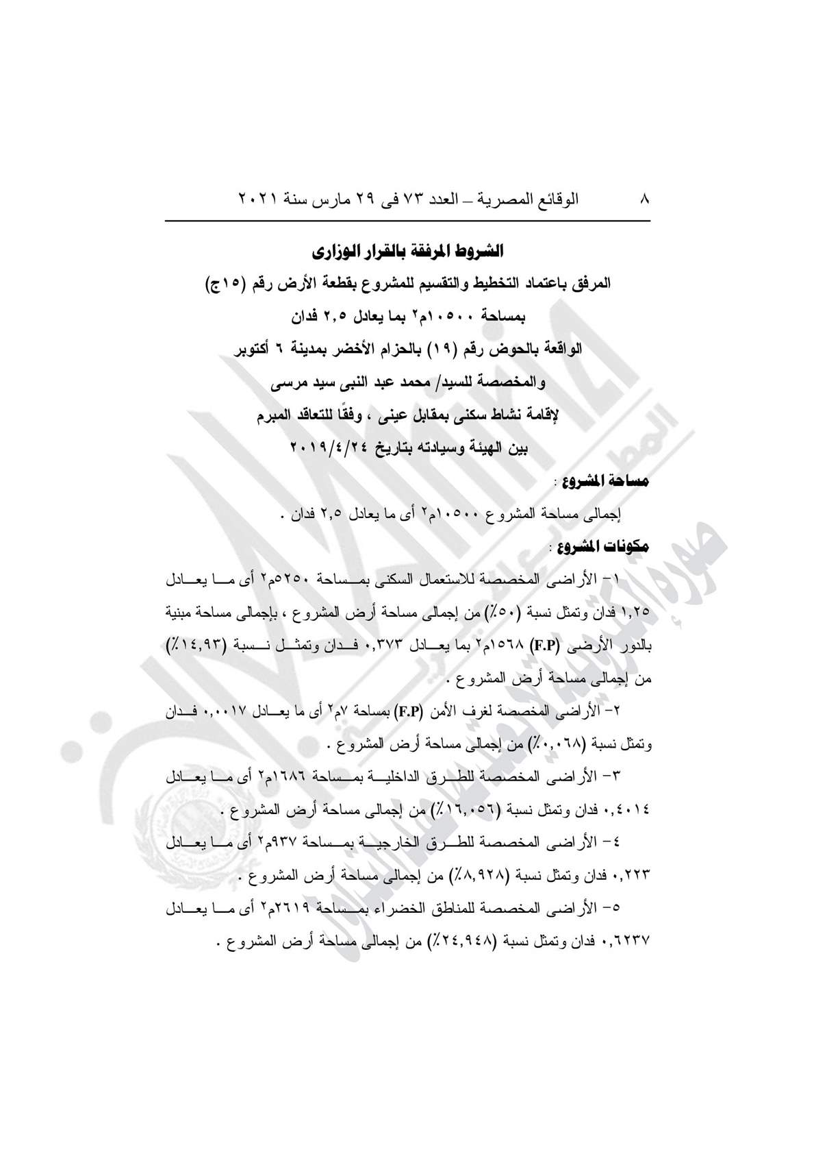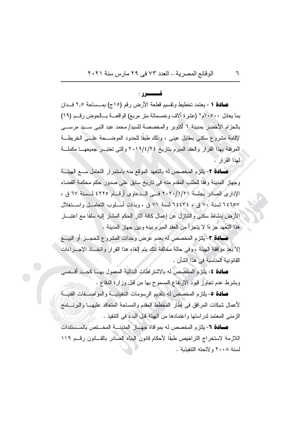 وينص القرار على اعتماد تخطيط وتقسيم قطعة الأرض رقم 15 ج بمساحة 2.5 فدان بما يعادل 10500 متر مربع، الواقعة بالحوض رقم 19 بالحزام الأخضر بمدينة 6 أكتوبر؛ والمخصصة لـ محمد عبد النبي سيد مرسي لإقامة مشروع سكني بمقابل عيني، وذلك طبقًا للحدود الموضحة على الخريطة المرفقة بالقرار.