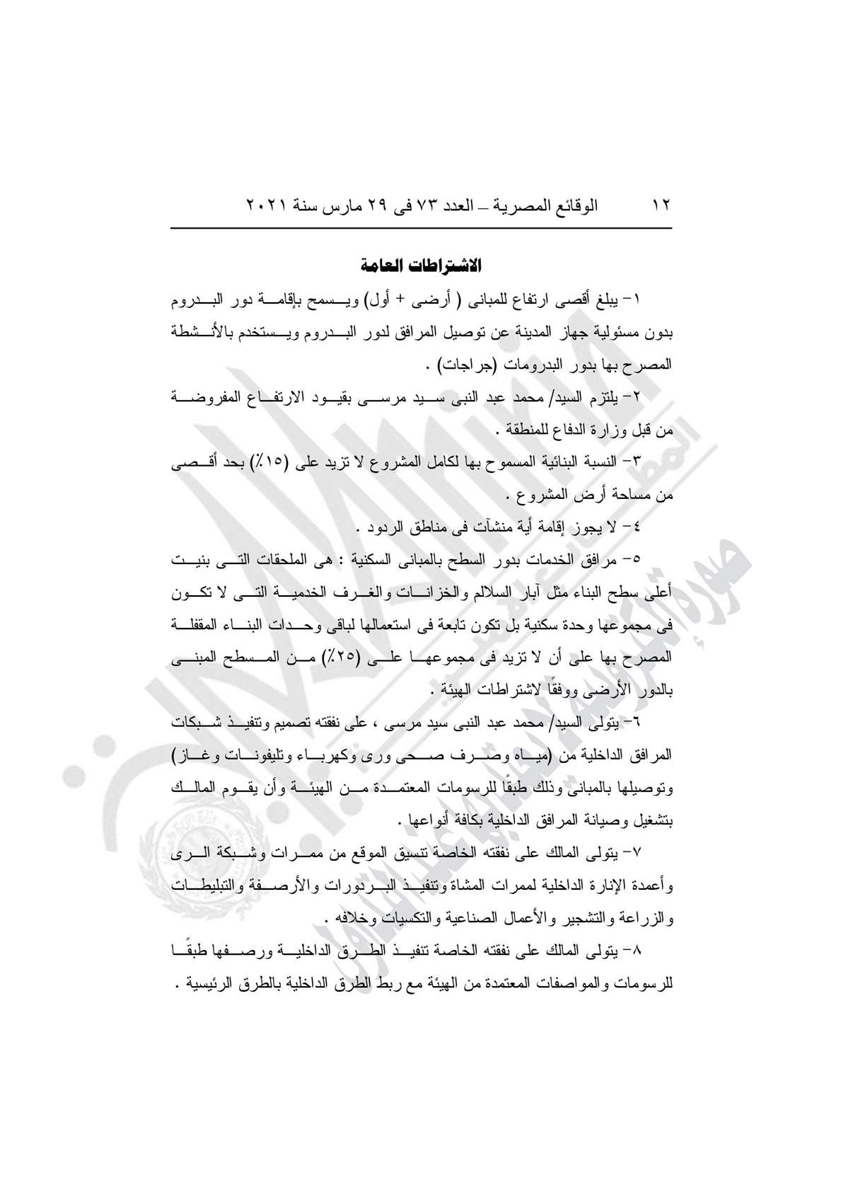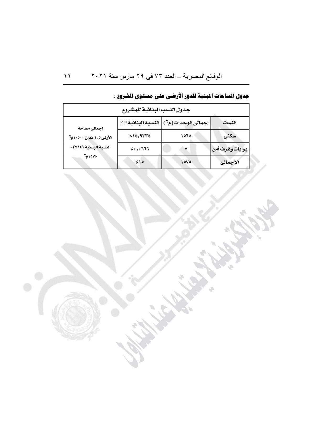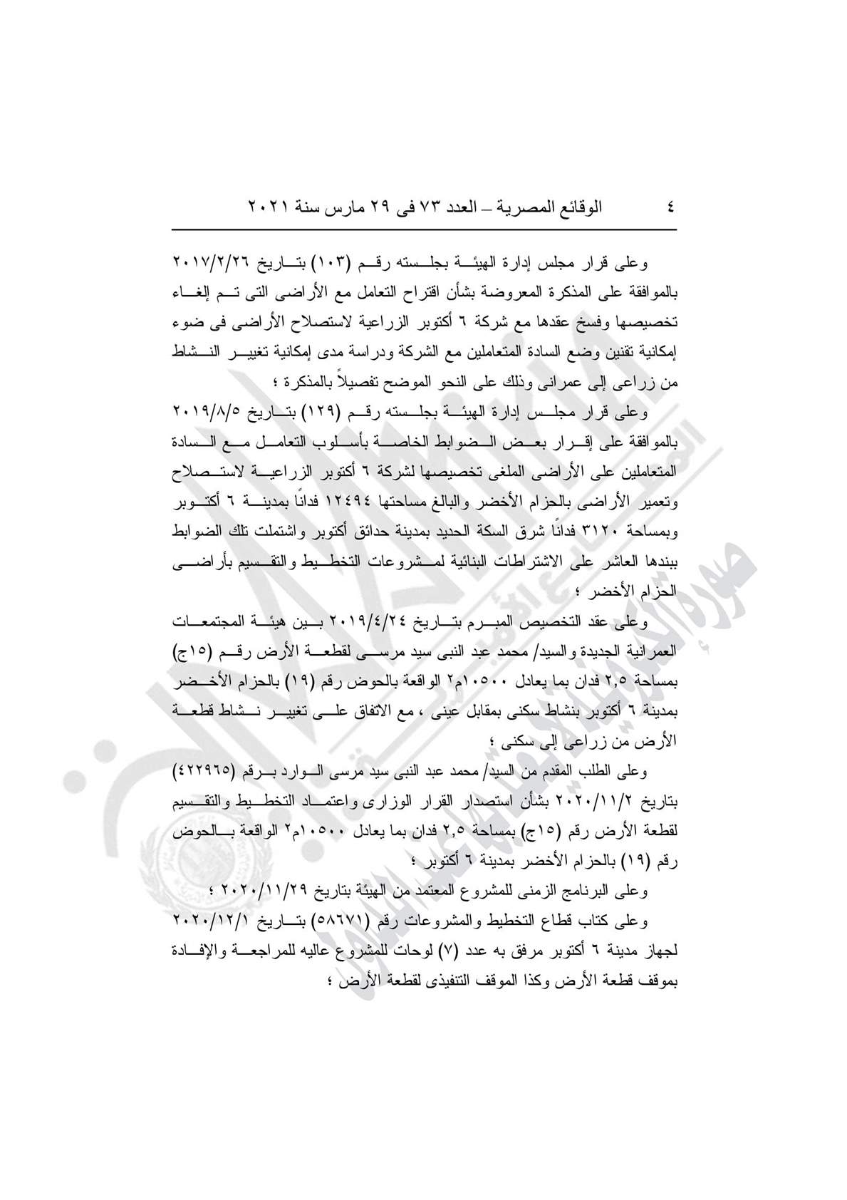 نشرت جريدة الوقائع المصرية في عددها رقم 73، الصادر في 29 مارس قرار وزارة الإسكان والمرافق والمجتمعات العمرانية رقم 39 لسنة 2021، باعتماد تخطيط وتقسيم قطعة الأرض رقم 12 ج بمساحة 2.5 فدان، بما يعادل 10500 متر مربع الواقعة بالحوض رقم 19 بالحزام الأخضر بمدينة 6 أكتوبر، لإقامة مشروع سكني متكامل بمقابل عيني.