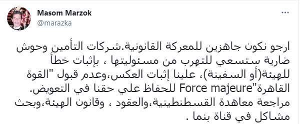 وكتب السفير معصوم مرزوق تغريدة على "تويتر": "أرجو نكون جاهزين للمعركة القانونية.. شركات التأمين وحوش ضارية ستسعى للتهرب من مسئوليتها، بإثبات خطأ للهيئة (أو السفينة)، علينا إثبات العكس، وعدم قبول "القوة القاهرة"Force majeure للحفاظ على حقنا في التعويض".