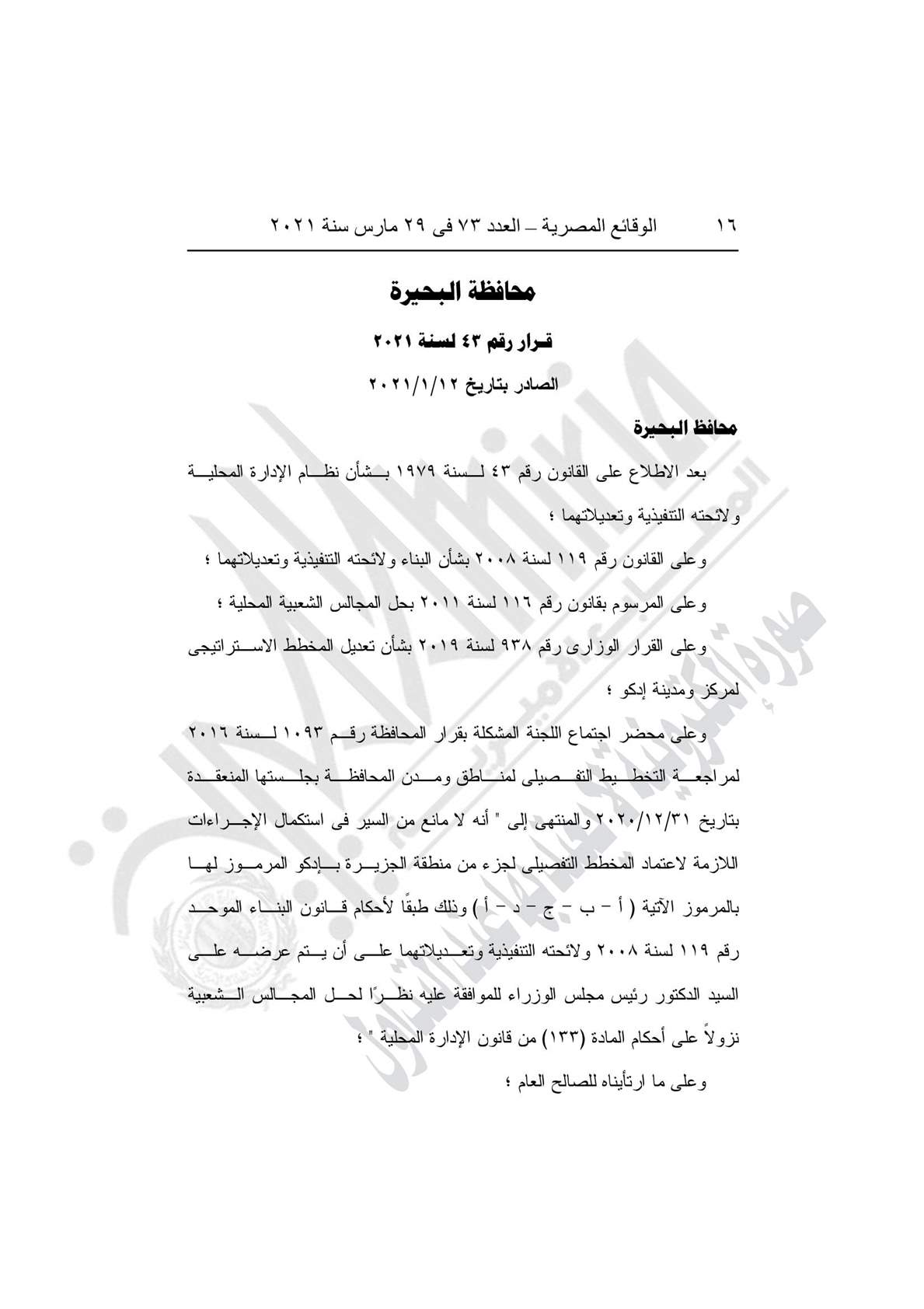 القرار رقم 43 لسنة 2021، بشأن اعتماد المخطط التفصيلي لجزء من منطقة الجزيرة بمدينة إدكو، وفقًا لأحكام القانون رقم 119 لسنة 2008، ولائحته التنفيذية وتعديلاتهما والقرارات الصادرة والمنظمة لذلك.