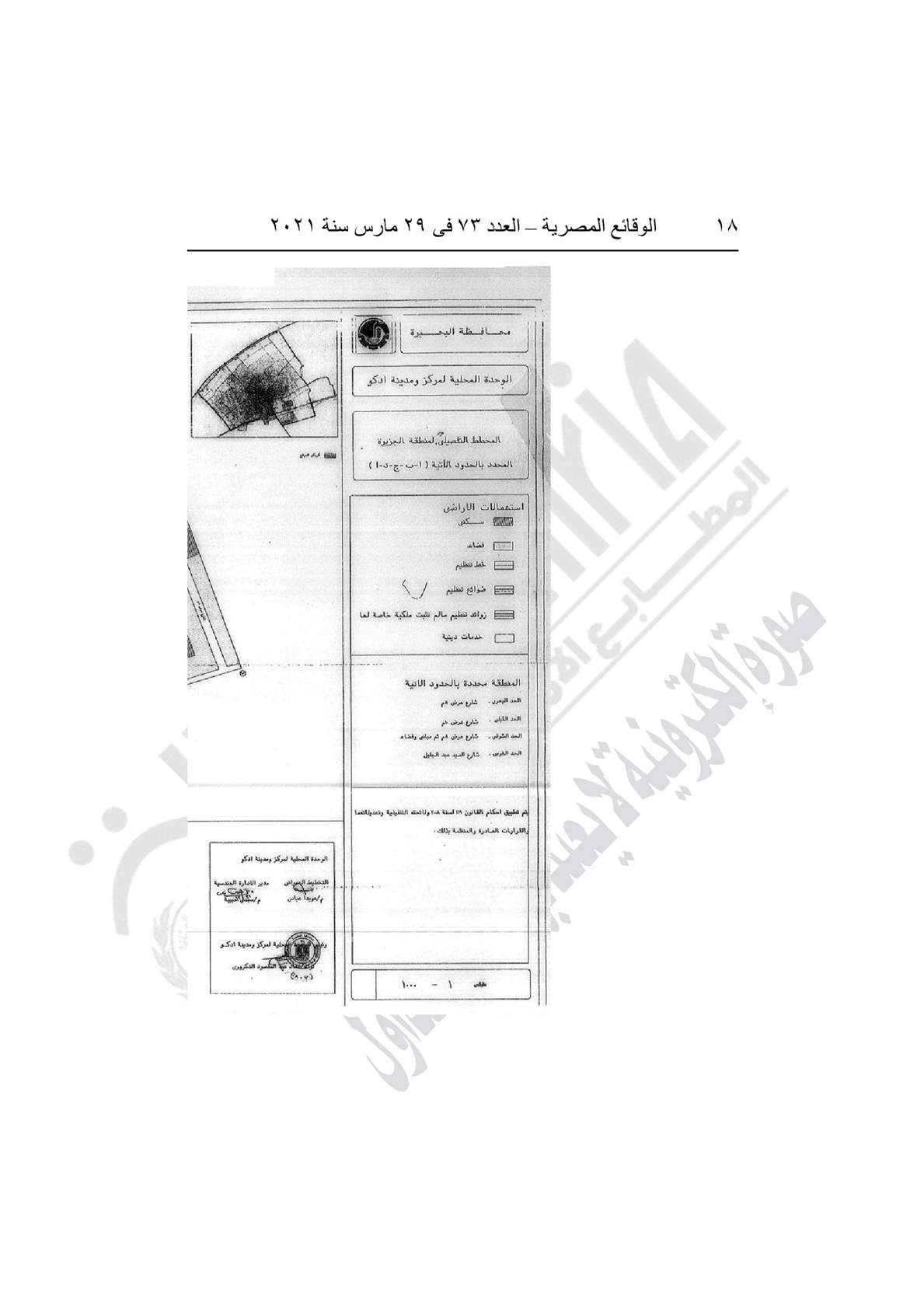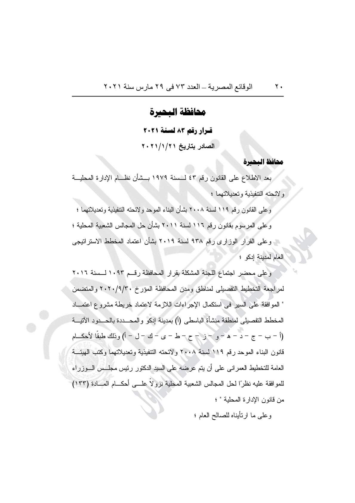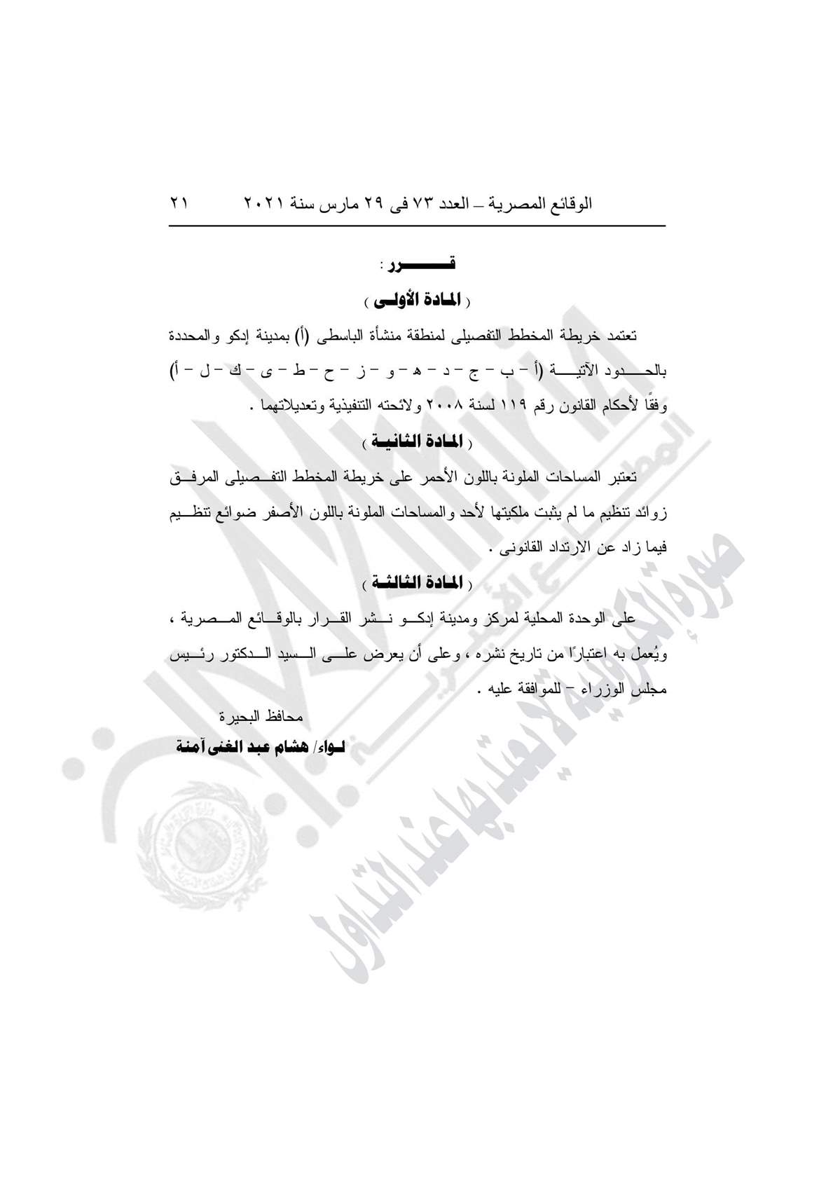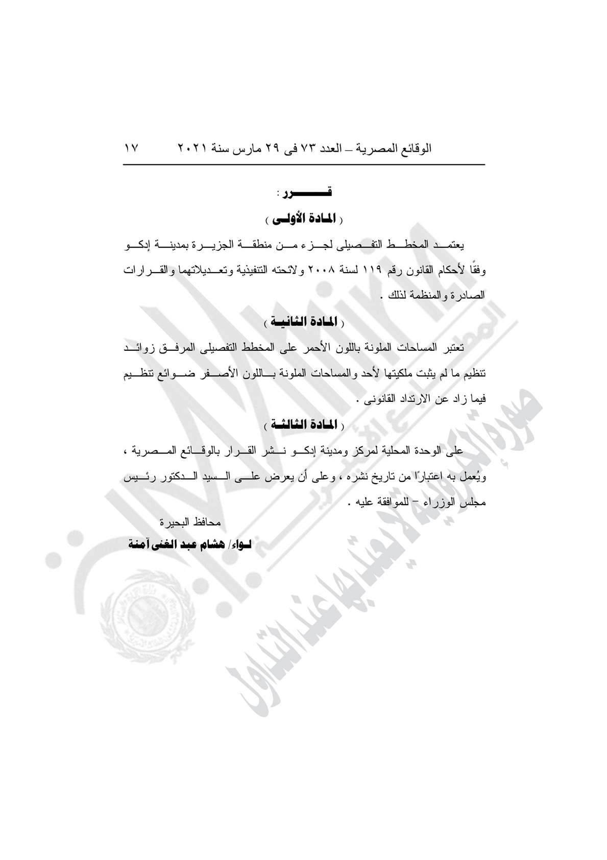نشرت جريدة الوقائع المصرية في عددها رقم 73، الصادر في 29 مارس 2021، 3 قرارات لمحافظة البحيرة، بشأن اعتماد المخطط التفصيلي لجزء من منطقة الجزيرة ومنطقة منشأة الباسطي (أ)، وخريطة خط تنظيم شارع الجلاء بمدينة إدكو.