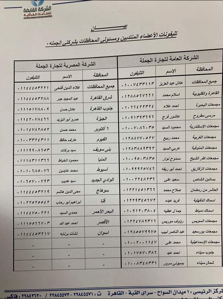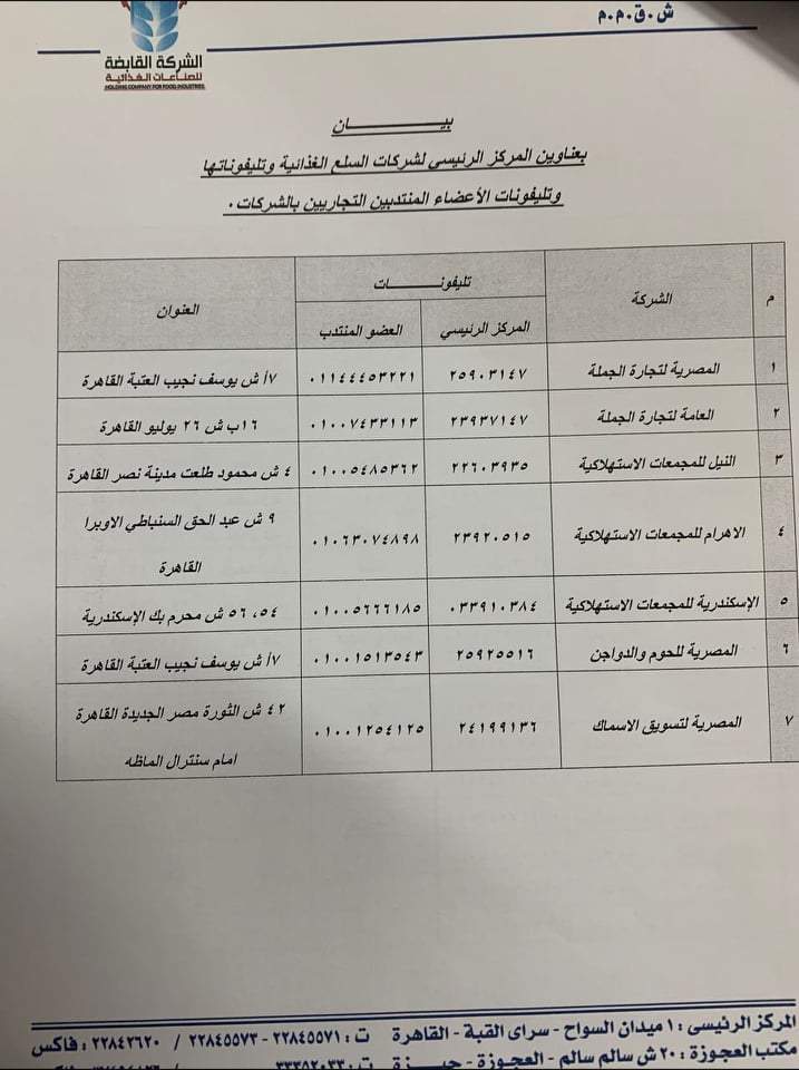 أعلنت وزارة التموين والتجارة الداخلية عناوين منافذ شركات المجمعات الإستهلاكية وشركتي الجملة