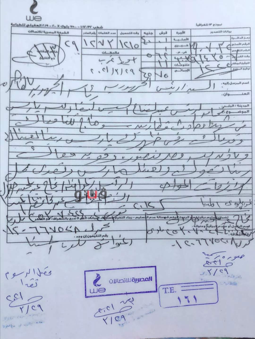 وجاءت نص التلغراف: البقاء لله يا ريس في شهداء حادث قطاري سوهاج كلنا معاك وقدامك وفي دهرك يا ريس ربنا يعينك وبإذن الله مصر منصورة وقوية معاك ربنا يقويك ويعينك يا ريس وبتعدي كل الأزمات.