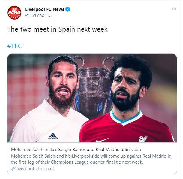 وذكر موقع نادي ليفربول الانجليزي للأخبار في تقريره أن محمد صلاح سيواجه سيرجيو راموس مدافع وريال مدريد قبل مواجهة ليفربول، مؤكدة أن محمد صلاح يصر على أن مباراة ليفربول المقبلة في دوري أبطال أوروبا مع ريال مدريد لا تتعلق به وبسيرجيو راموس.