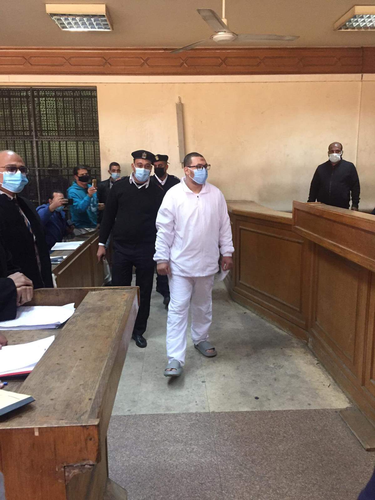 وظهر المتهم مرتديا الزى الابيض وبدأ يهمس فى أذن محاميه .