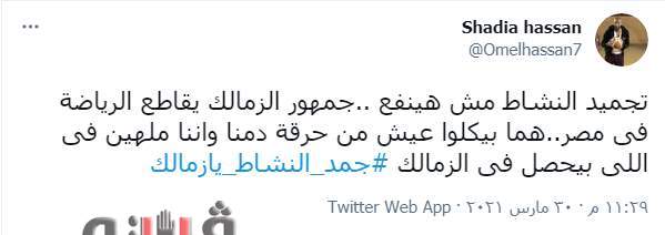 وأضافت شادية حسان: «تجميد النشاط مش هينفع.. جمهور الزمالك يقاطع الرياضة في مصر.. هما بياكلوا عيش من حرقة دمنا وإننا ملهين في اللي بيحصل في الزمالك #جمد_النشاط_يازمالك».