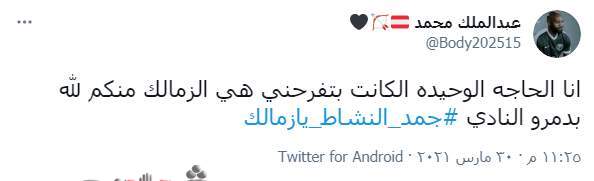 وقال محمد عبد الملك: «أنا الحاجة الوحيدة اللي كانت بتفرحني هي الزمالك.. منكم لله دمرتوا النادي #جمد_النشاط_يازمالك».