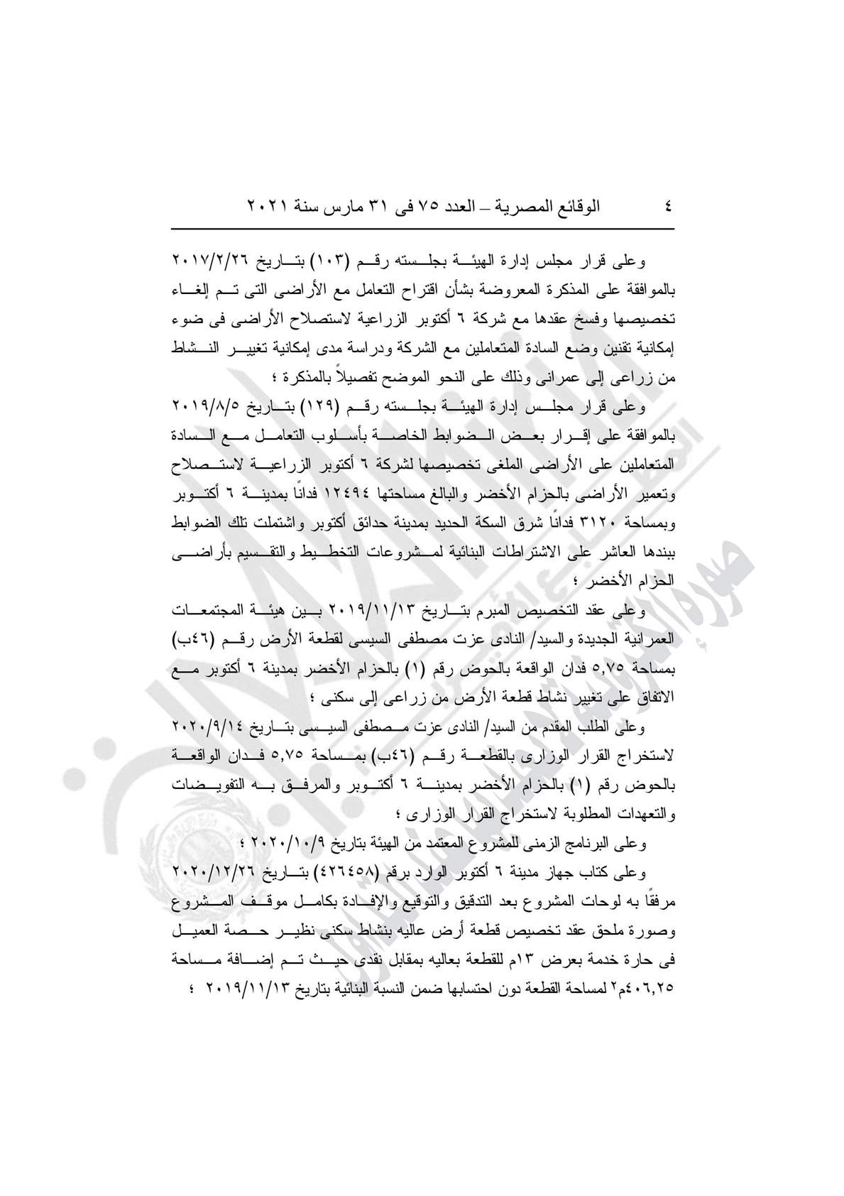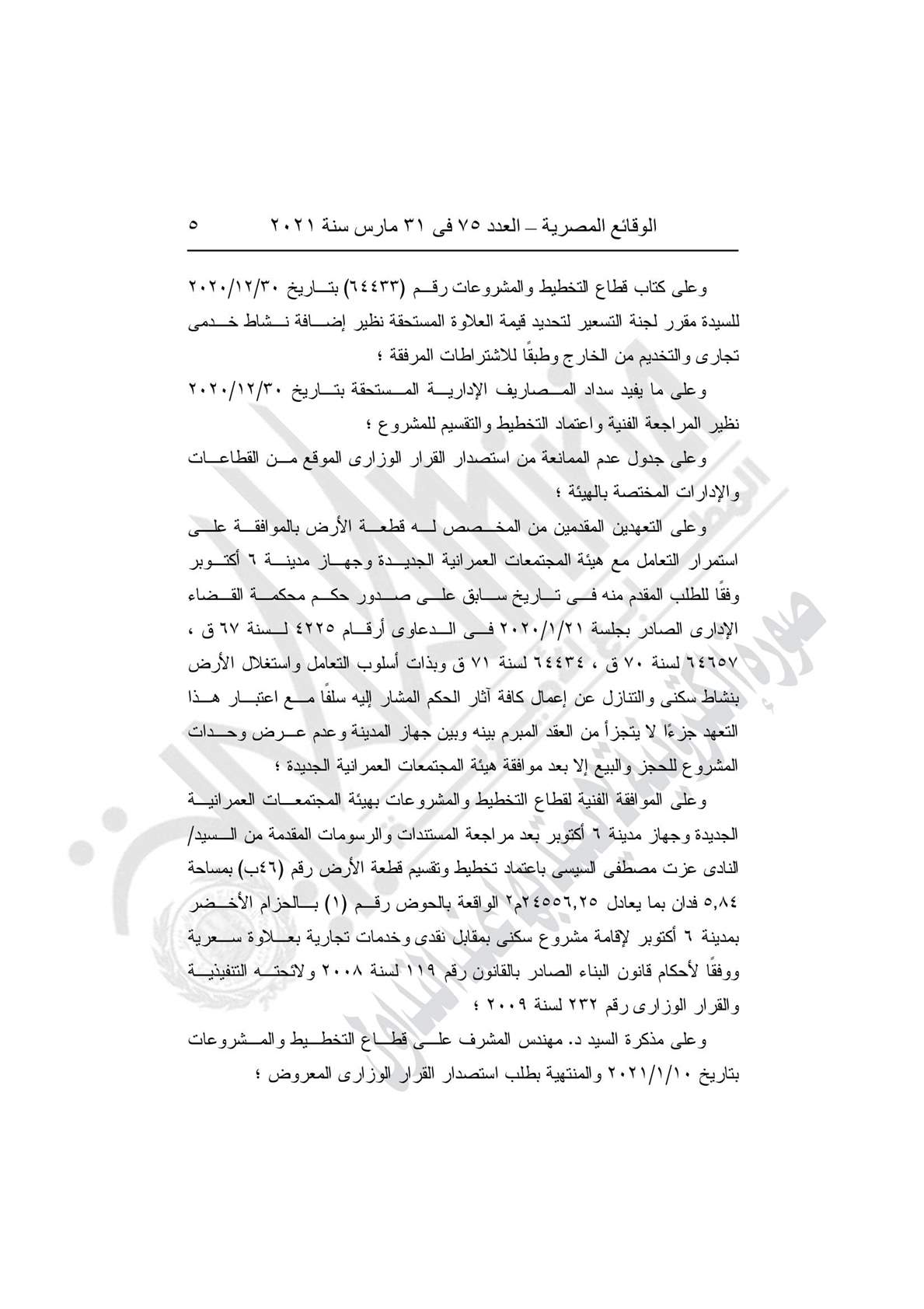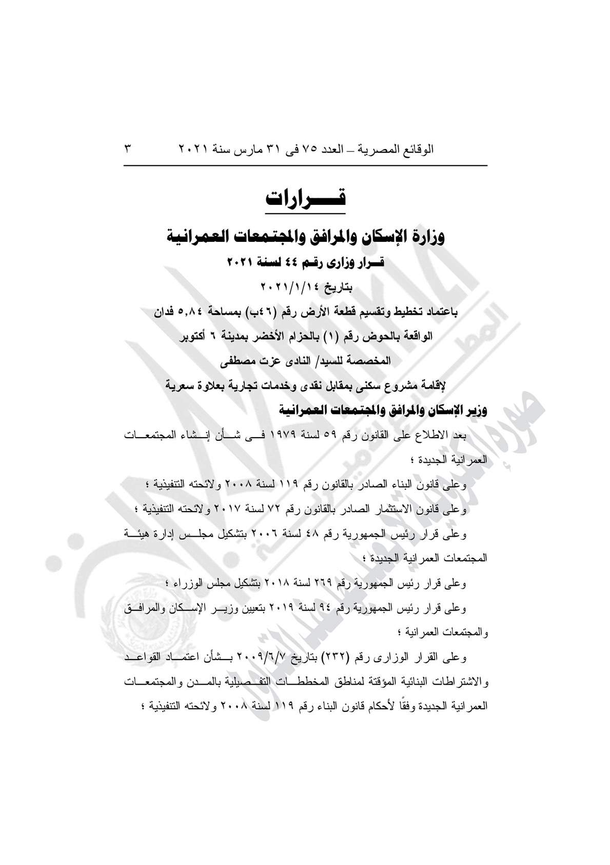نشرت جريدة الوقائع المصرية في عددها رقم 75، الصادر في 31 مارس 2021، قرار وزارة الإسكان والمرافق والمجتمعات العمرانية رقم 44 لسنة 2021، بشأن باعتماد تخطيط وتقسيم قطعة الأرض رقم (46ب) بمساحة 5.84 فدان الواقعة بالحوض رقم (1) بالحزام الأخضر بمدينة 6 أكتوبر، لإقامة مشروع سكنى بمقابل نقدى وخدمات تجارية بعلاوة سعرية.