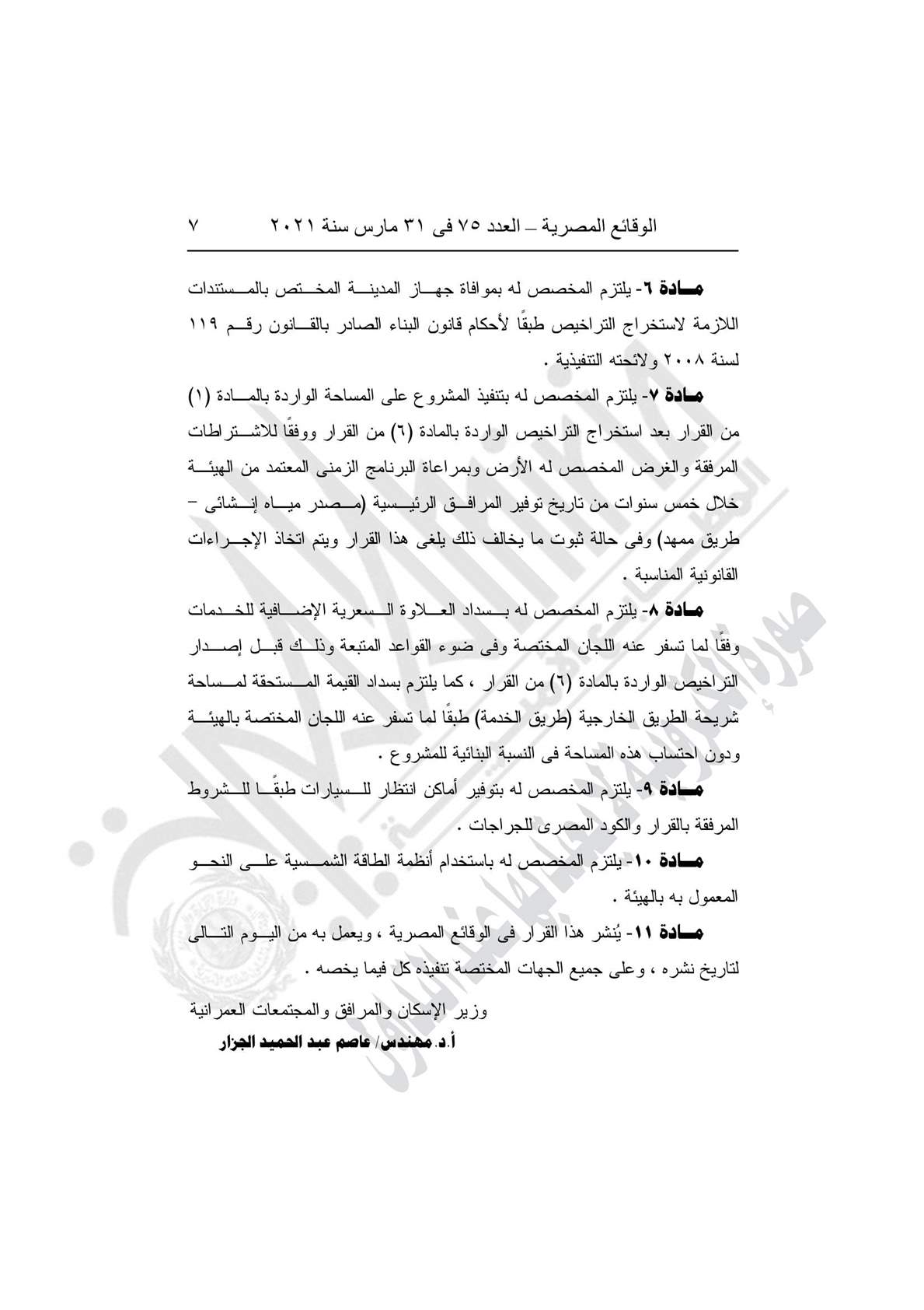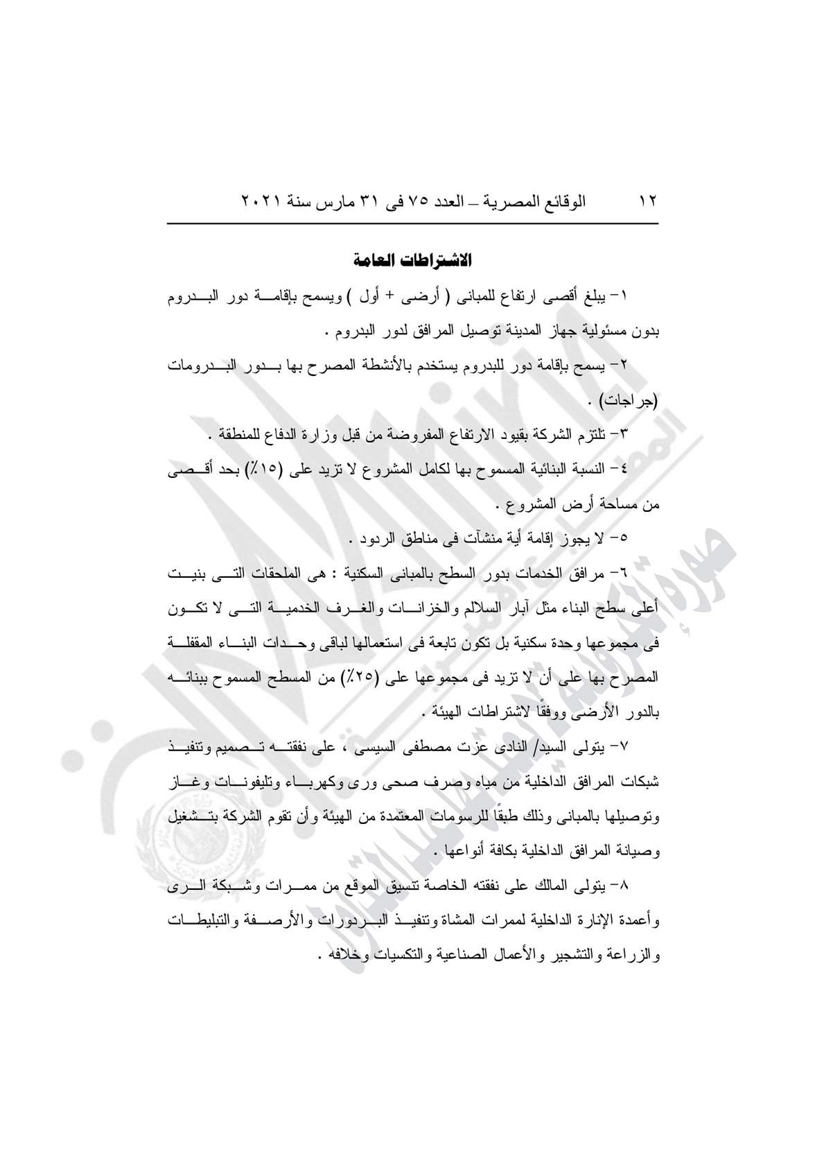 كما يلتزم المخصص له بالاشتراطات البنائية المعمول بها كحد أقصى وبشرط عدم تجاوز قيود الارتفاع المسموح بها من قبل وزارة الدفاع .