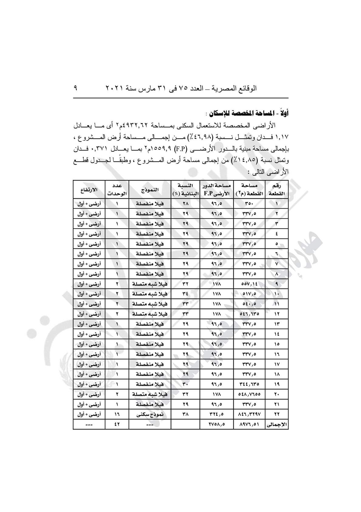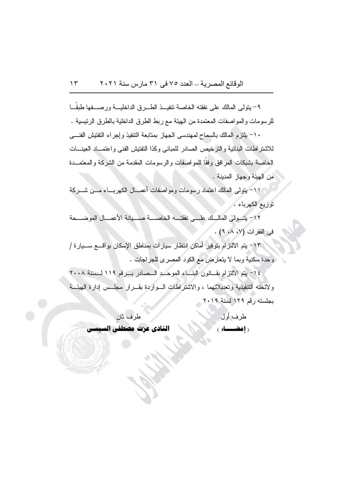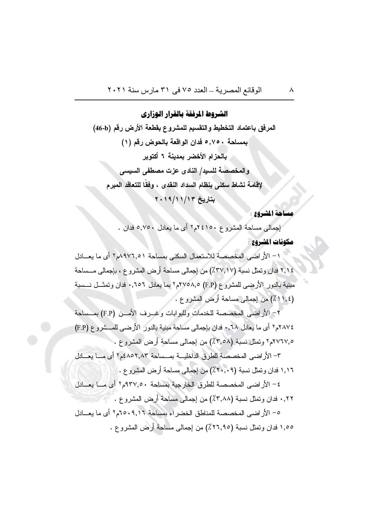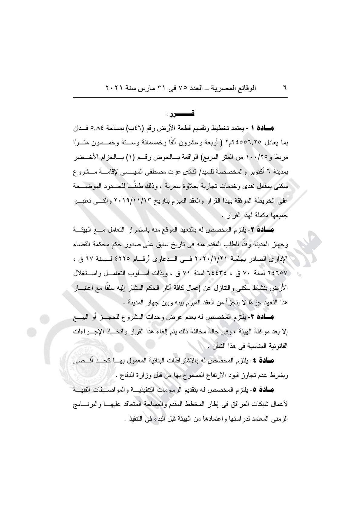 جاء في المادة الأولى للقرار "يعتمد تخطيط وتقسيم قطعة الأرض رقم (46ب) بمساحة 5.84 فدان بما يعادل 24556.25مترًا مربعًا، الواقعة بالحوض رقم (1) بالحزام الأخضر بمدينة 6 أكتوبر والمخصصة لـ النادى عزت مصطفى السيسى؛ لإقامة مشروع سكنى بمقابل نقدى وخدمات تجارية بعلاوة سعرية، وذلك طبقًا للحدود الموضحة على الخريطة المرفقة بهذا القرار والعقد المبرم بتاريخ 13/11/2019 والتى تعتبر جميعها مكملة لهذا القرار.