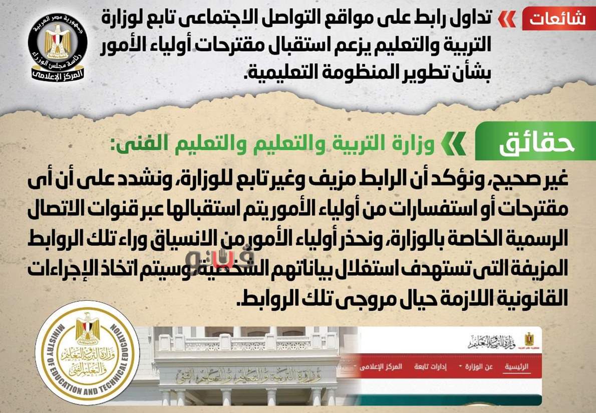 وتواصل المركز الإعلامي لمجلس الوزراء مع وزارة التربية والتعليم والتعليم الفني، والتي نفت تلك الأنباء، مُؤكدةً أنه لا صحة للرابط المتداول على مواقع التواصل الاجتماعي بشأن استقبال مقترحات أولياء الأمور بشأن تطوير المنظومة التعليمية.