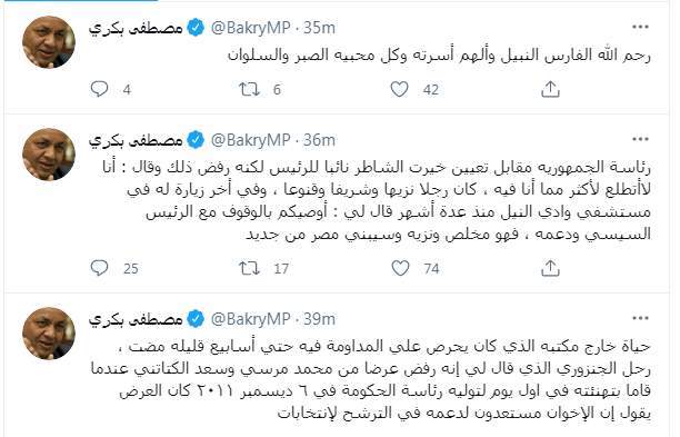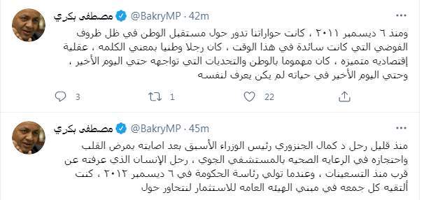 وكتب مصطفى بكري تغريدة على تويتر "منذ قليل رحل د كمال الجنزوري رئيس الوزراء الأسبق بعد إصابته بمرض القلب واحتجازه في الرعاية الصحية بالمستشفي الجوي، رحل الإنسان الذي عرفته عن قرب منذ التسعينيات، وعندما تولي رئاسة الحكومة في ٦ ديسمبر ٢٠١٢ ، كنت ألتقيه كل جمعة في مبني الهيئة العامة للاستثمار لنتحاور