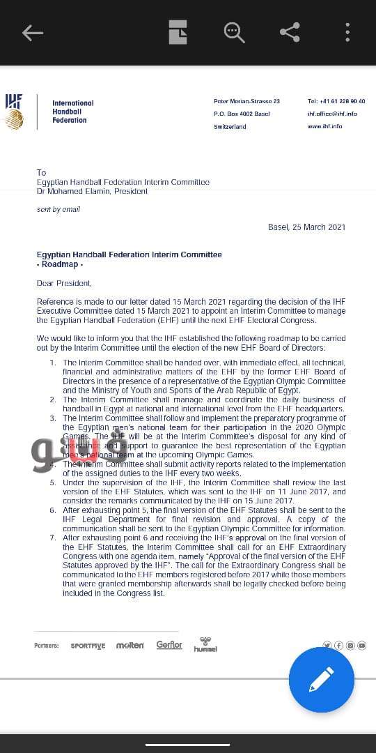 نشير إلى رسالتنا المؤرخة 15 مارس 2021 بخصوص قرار الاتحاد الدولي بتاريخ 15 مارس 2021 لتعيين لجنة مؤقتة لإدارة الاتحاد المصري لكرة اليد حتى تجري الانتخابات المقبلة.