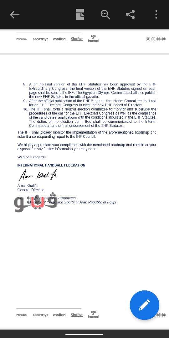 لم يكتفي رئيس اتحاد اليد وأرسل خطاب بتاريخ 25 مارس بتوقيع ذراعه الأيمن آمال خليفة المدير التنفيذي للاتحاد الدولي يحدد خارطة الطريق بالنسبة للجنة التي تم اختيارها.