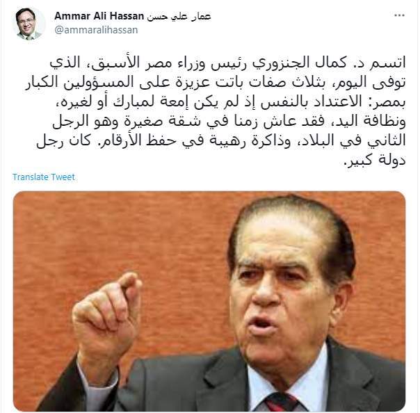 أما الباحث عمار علي حسن فقال عن الراحل كمال الجنزوري "اتسم د. كمال الجنزوري رئيس وزراء مصر الأسبق، الذي توفى اليوم، بثلاث صفات باتت عزيزة على المسؤولين الكبار بمصر: الاعتداد بالنفس إذ لم يكن إمعة لمبارك أو لغيره، ونظافة اليد، فقد عاش زمنا في شقة صغيرة وهو الرجل الثاني في البلاد، وذاكرة رهيبة في حفظ الأرقام. كان رجل دولة كبير"