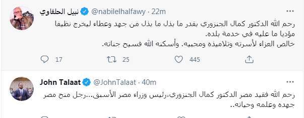 وقال النائب جون طلعت "رحم الله فقيد مصر الدكتور كمال الجنزوري،رئيس وزراء مصر الأسبق...رجل منح مصر جهده وعلمه وحياته.".