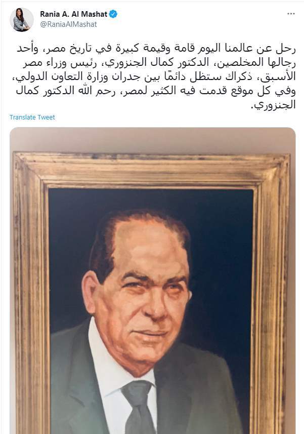 وقالت وزيرة التعاون الدولي رانيا المشاط "رحل عن عالمنا اليوم قامة وقيمة كبيرة في تاريخ مصر، وأحد رجالها المخلصين، الدكتور كمال الجنزوري، رئيس وزراء مصر الأسبق، ذكراك ستظل دائمًا بين جدران وزارة التعاون الدولي، وفي كل موقع قدمت فيه الكثير لمصر، رحم الله الدكتور كمال الجنزوري"