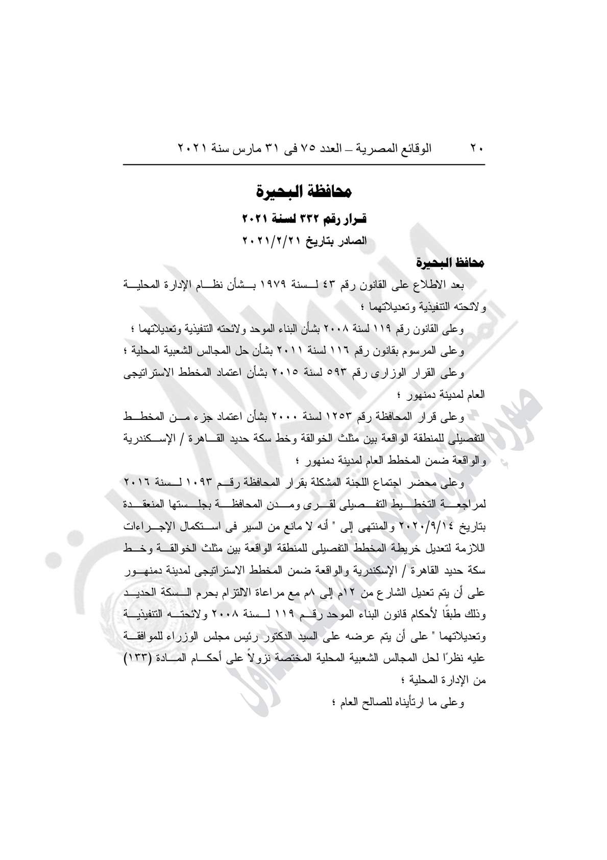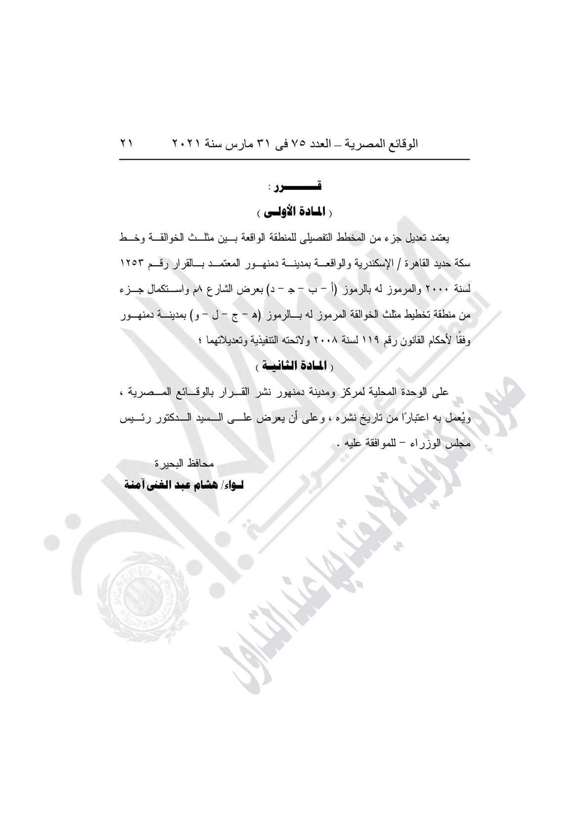 والقرار رقم 332 لسنة 2021، بشأن اعتماد تعديل جزء من المخطط التفصيلى للمنطقة الواقعة بين مثلث الخوالقة وخط سكة حديد القاهرة- الإسكندرية والواقعة بمدينة دمنهور المعتمد بالقرار رقم 1253 لسنة 2000 والمرموز له بالرموز (أ - ب - ﺠ - د) بعرض الشارع 8 متر واستكمال جزء من منطقة تخطيط مثلث الخوالقة المرموز له بالرموز (ﻫ - ج- ل- و) بمدينة دمنهور وفقًا لأحكام القانون رقم 119 لسنة 2008 ولائحته التنفيذية وتعديلاتهما.