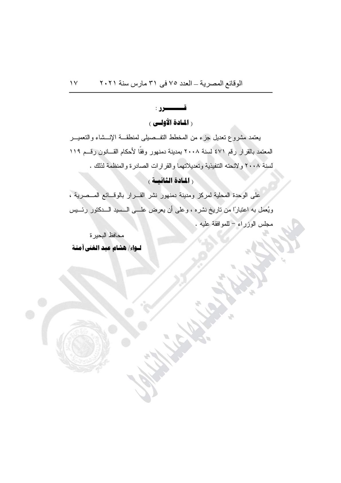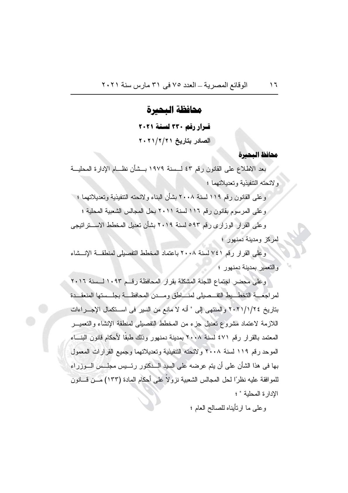 القرار رقم 330 لسنة 2021، بشأن اعتماد مشروع تعديل جزء من المخطط التفصيلى لمنطقة الإنشاء والتعمير المعتمد بالقرار رقم 471 لسنة 2008 بمدينة دمنهور وفقًا لأحكام القانون رقم 119 لسنة 2008 ولائحته التنفيذية وتعديلاتهما والقرارات الصادرة والمنظمة لذلك.