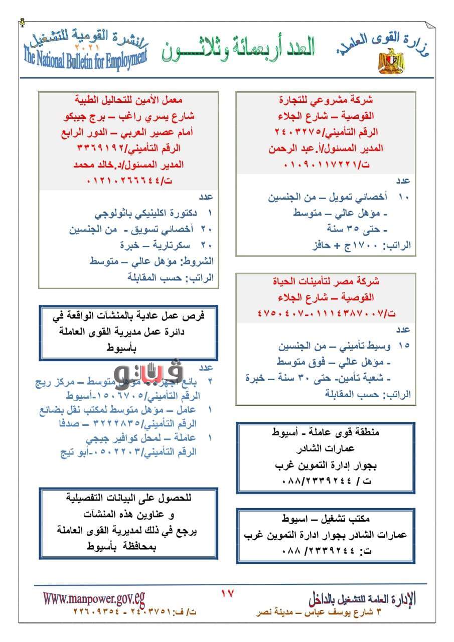 وهناك عدد من الوظائف في أسيوط تضمنت : 2 مهندس ميكانيكي ، ودكتور إكلينيكي ، وفنى أعمال كنترول ، و 5 مهندس ، و 5 كيميائي ، و 5 موظف إداري ، و 5 بائع ، و 5 مساعد بائع ، و 200 فرد أمن براتب 3000 جنيه ، ومسئول تمويل ، و 10 أخصائي تمويل ، و 15 وسيط تأمينى ، و 20 اخصائي تسويق ، و 20 سكرتارية ، وبائع أجهزة وعمال عاديين .
