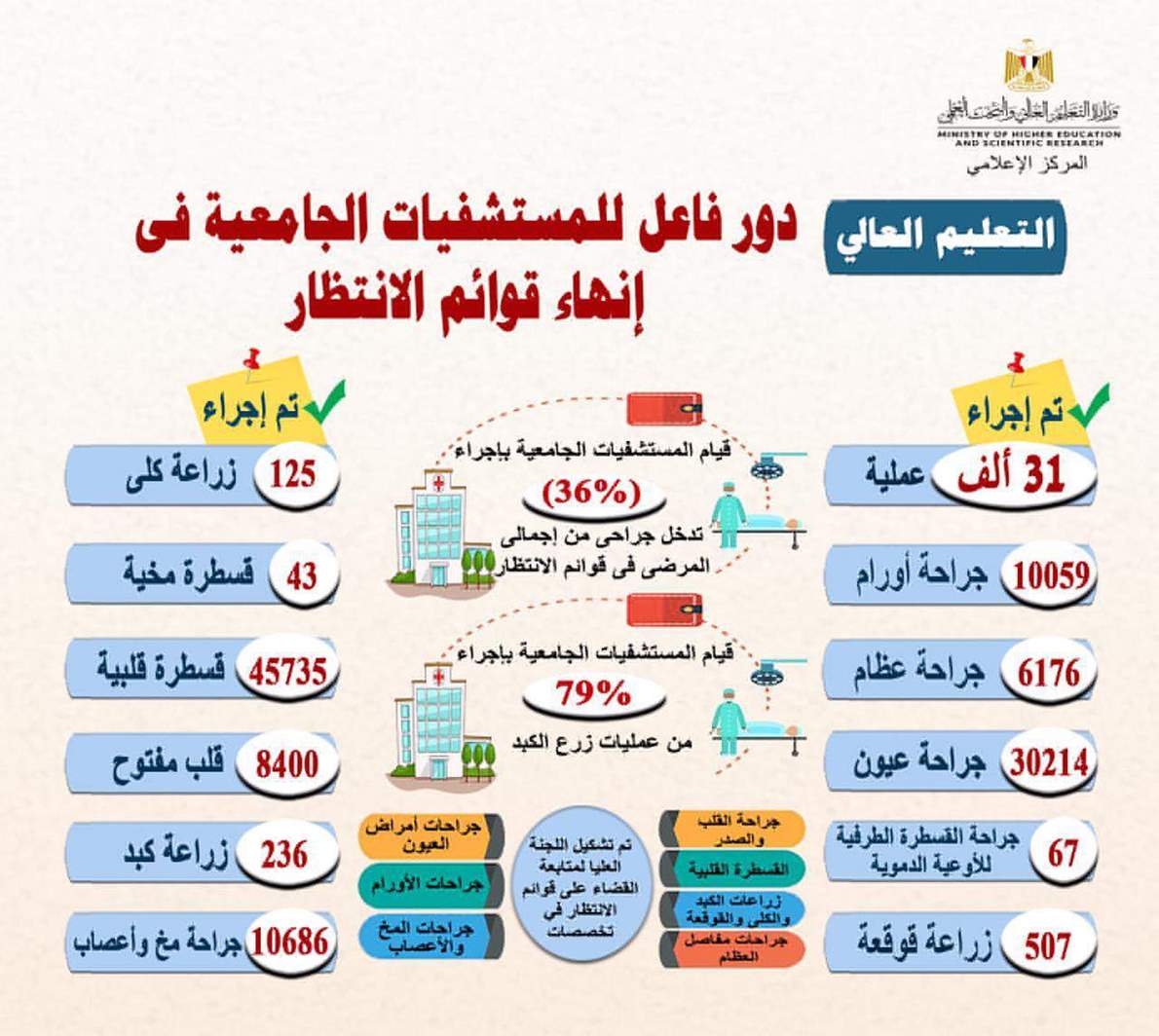 وأشار التقرير إلى قيام المستشفيات الجامعية بإجراء حوالى 36% تدخلا جراحيا من إجمالى المرضى فى قوائم الانتظار و 79% من عمليات زرع الكبد، كما بلغ إجمالى عدد العمليات التى أجرتها المستشفيات الجامعية حوالى 31 ألف عملية.