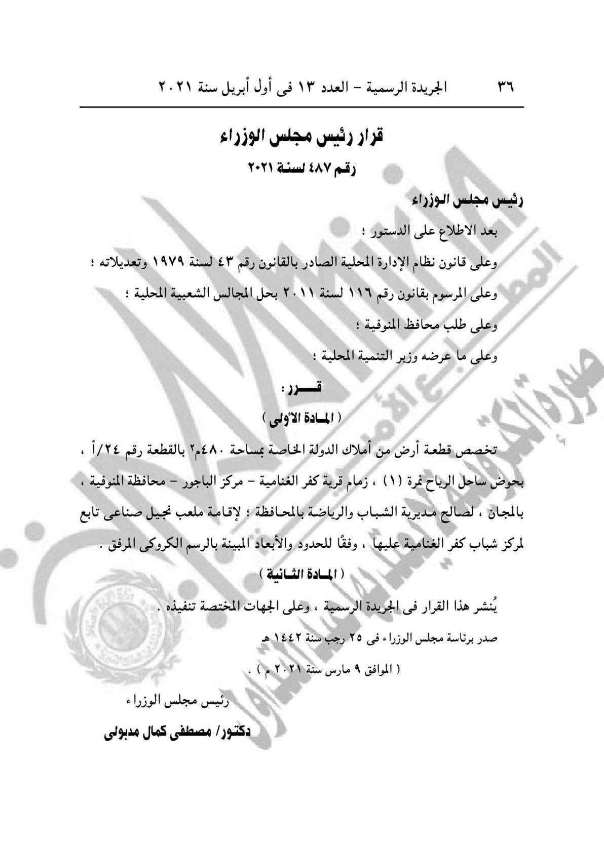 القرار رقم 487 لسنة 2021 بتخصيص قطعة أرض من أملاك الدولة الخاصة بزمام قرية كفر الغنامية، مركز الباجور محافظة المنوفية بالمجان، لإقامة ملعب نجيل صناعي تابع لمركز شباب كفر الغنامية عليها.