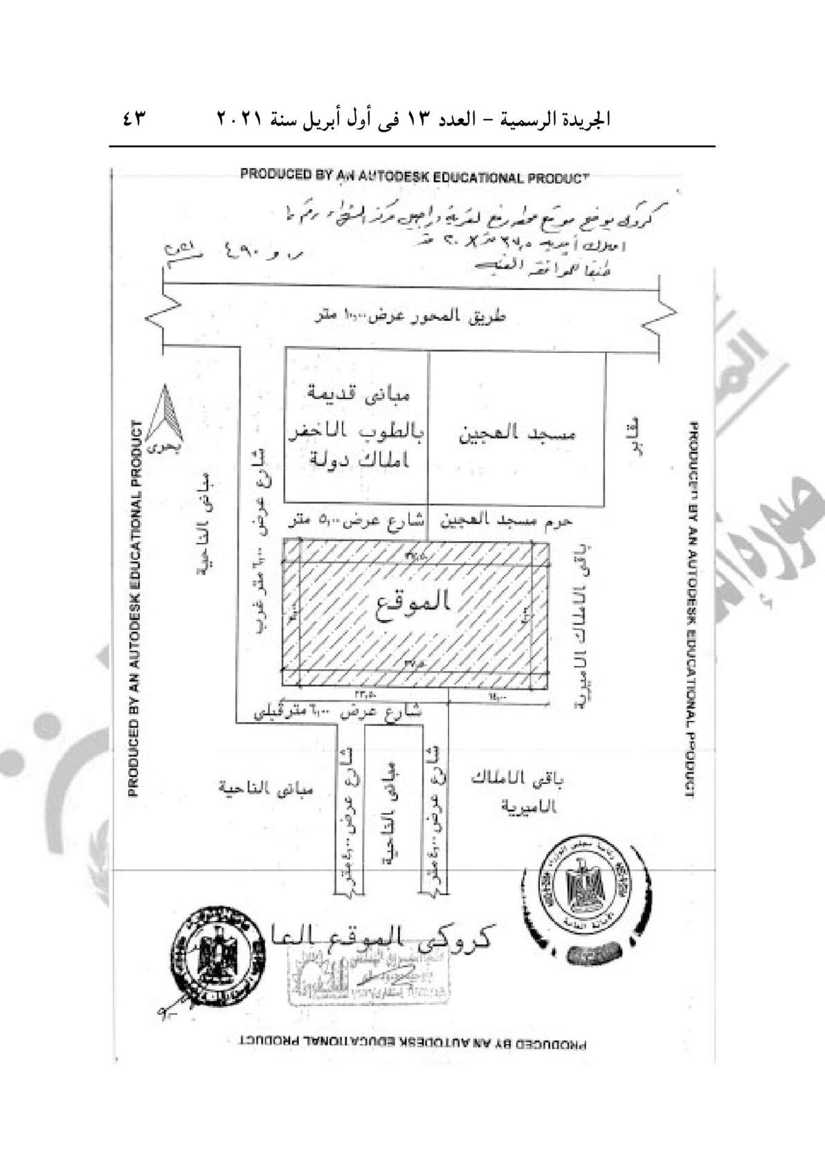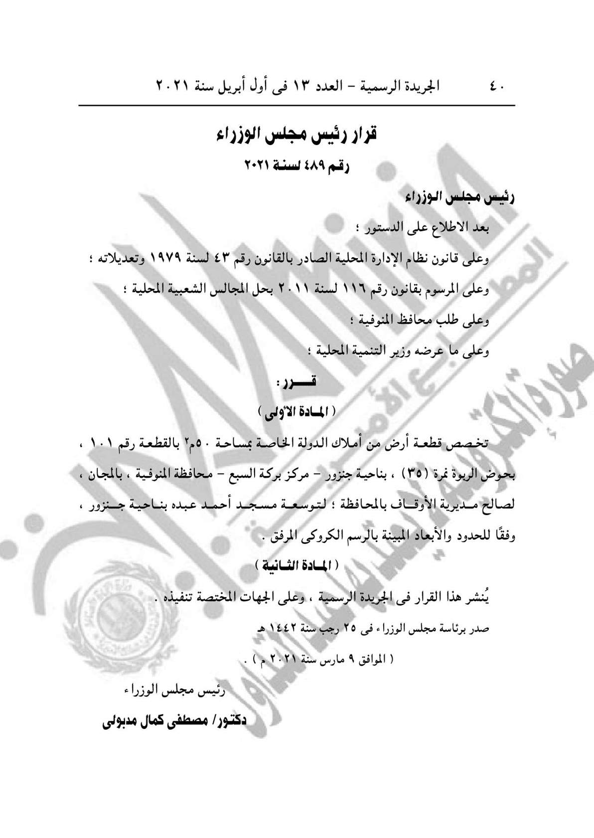 والقرار رقم 489 لسنة 2021، بتخصيص قطعة أرض من أملاك الدولة الخاصة بناحية جنزور مركز بركة السبع محافظة المنوفية بالمجان، لتوسعة مسجد أحمد عبده بناحية جنزور.
