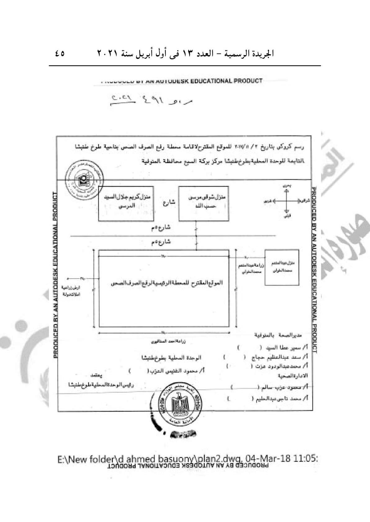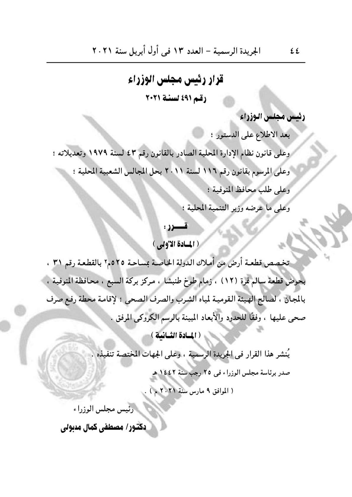 والقرار رقم 491 لسنة 2021، بتخصيص قطعة أرض من أملاك الدولة الخاصة بزمام طوخ طنبشا، مركز بركة السبع محافظة المنوفية بالمجان، لإقامة محطة رفع صرف صحي.