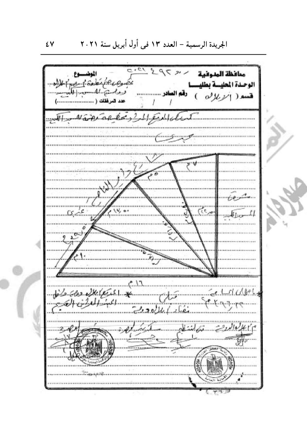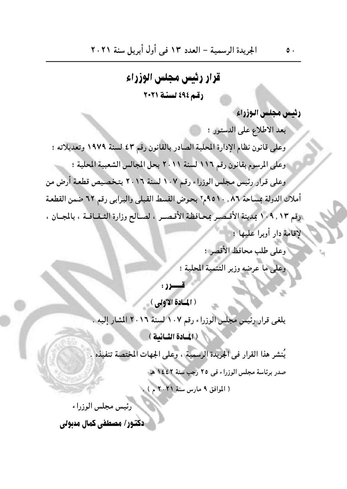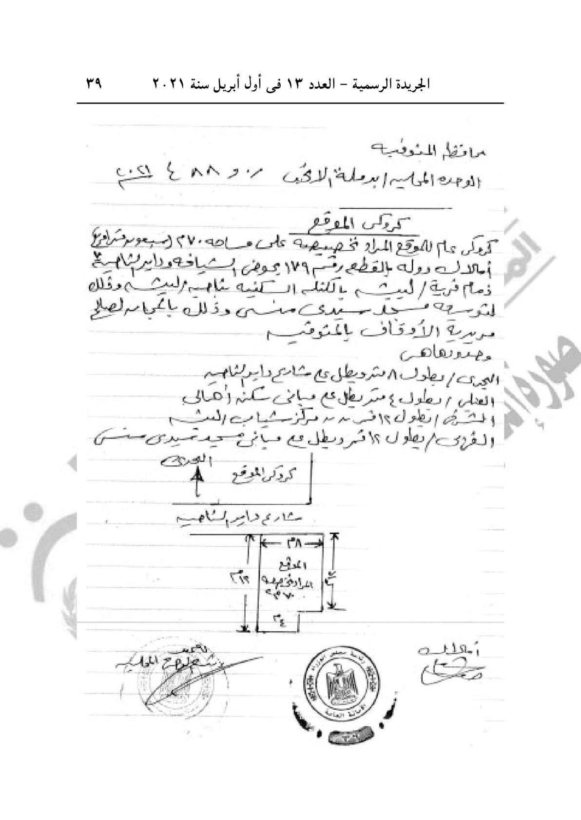 والقرار رقم 492 لسنة 2021، بتخصيص قطعة أرض من أملاك الدولة الخاصة بزمام قرية طليا مركز أشمون محافظة المنوفية بالمجان، لتوسعة المسجد الكبير بطليا (نازلي سليمان).