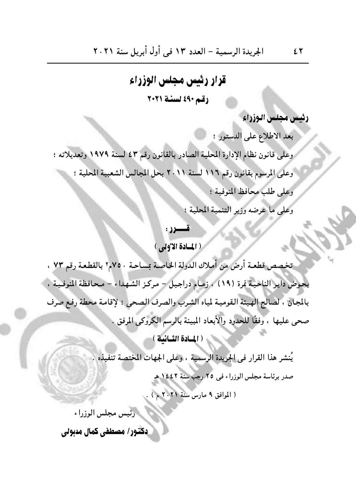 والقرار رقم 490 لسنة 2021، بتخصيص قطعة أرض من أملاك الدولة الخاصة بزمام دراجيل مركز الشهداء محافظة المنوفية بالمجان، لإقامة محطة رفع صرف صحي عليها.