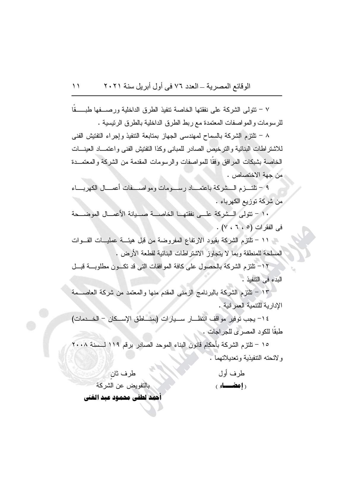 وتلتزم الشركة بتقديم الرسومات التنفيذية والمواصفات الفنية لأعمال شبكات المرافق في إطار المخطط المقدم والمساحة المتعاقد عليها والبرنامج الزمني المعتمد لدراستها واعتمادها من شركة العاصمة الإدارية للتنمية العمرانية قبل البدء في التنفيذ.