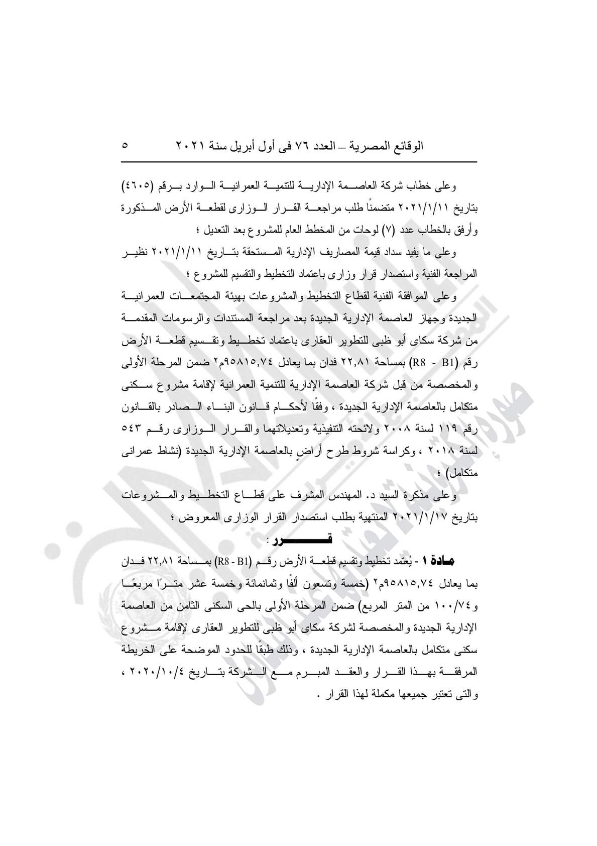 وينص القرار على اعتماد تخطيط وتقسيم قطعة الأرض رقم (RB-B1) بمساحة 22.81 فدان بما يعادل 95815.74 متر مربع، ضمن المرحلة الأولى بالحي السكني الثامن من العاصمة الإدارية الجديدة والمخصصة لشركة سكاي أبو ظبي للتطوير العقاري لإقامة مشروع سكني متكامل بالعاصمة الإدارية الجديدة.