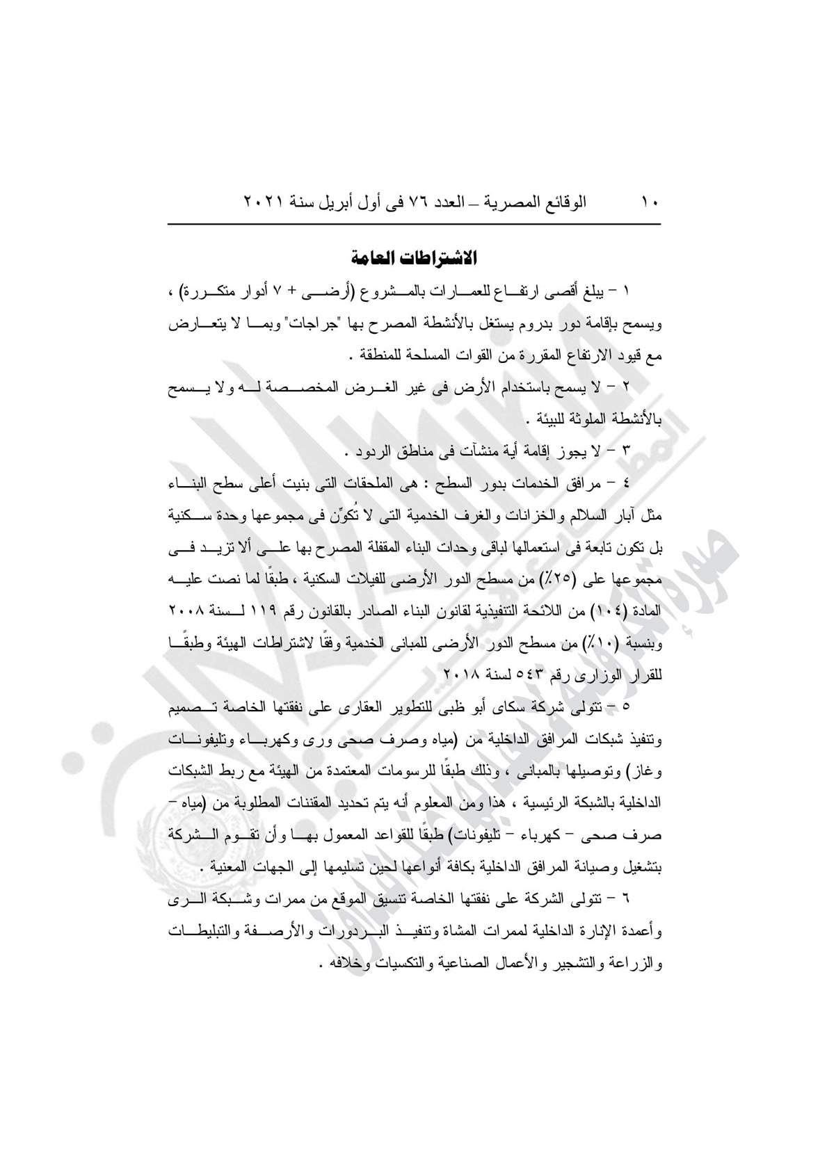 كما تلتزم الشركة بالاشتراطات البنائية المرفقة بهذا القرار كحد أقصى وبشرط عدم تجاوز قيود الارتفاع المسموح بها من قبل وزارة الدفاع .