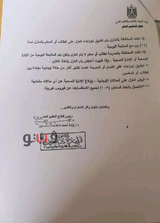 كما شددت وزارة التربية والتعليم على ضرورة اتخاذ الاحتياطات الواجبة نحو المخالط لحالة ايجابية والتي تتمثل فيما يلي :
