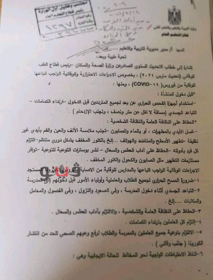 أصدرت وزارة التربية والتعليم والتعليم الفني، تعليمات رسمية لجميع المديريات التعليمية، بشأن الإجراءات الاحترازية الوقائية الواجب اتباعها في جميع المدارس والمنشآت التعليمية للوقاية من فيروس كورونا، خلال الفترة المتبقية من الفصل الدراسي الثاني من العام الدراسي الحالي 2020/2021.
