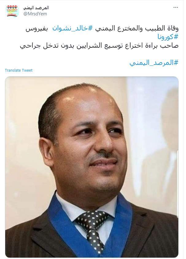 وكتب المرصد اليمني تغريدة على تويتر قال فيها: "وفاة الطبيب والمخترع اليمني #خالد_نشوان بفيروس #كورونا صاحب براءة اختراع توسيع الشرايين بدون تدخل جراحي".