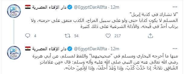 وكتبت دار الإفتاء المصرية تغريدة على تويتر "لا تشارك في كذبة إبريل" المسلم لا يكون كذابا حتى ولو على سبيل المزاح، الكذب متفق على حرمته، ولا يرتاب أحدٌ في قُبحه، والأدلة الشرعية على ذلك كثيرة"