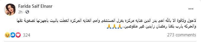 وكتبت فريدة سيف النصر قائلة: "لا حول ولا قوة إلا بالله، أخي بدر الدين عناية مركزة بعزل المستشفى، وأمي العناية المركزة اتعملت بالبيت بأجهزتها لصعوبة نقلها والحركة، يارب بلغنا رمضان زايدين غير منقوصين".