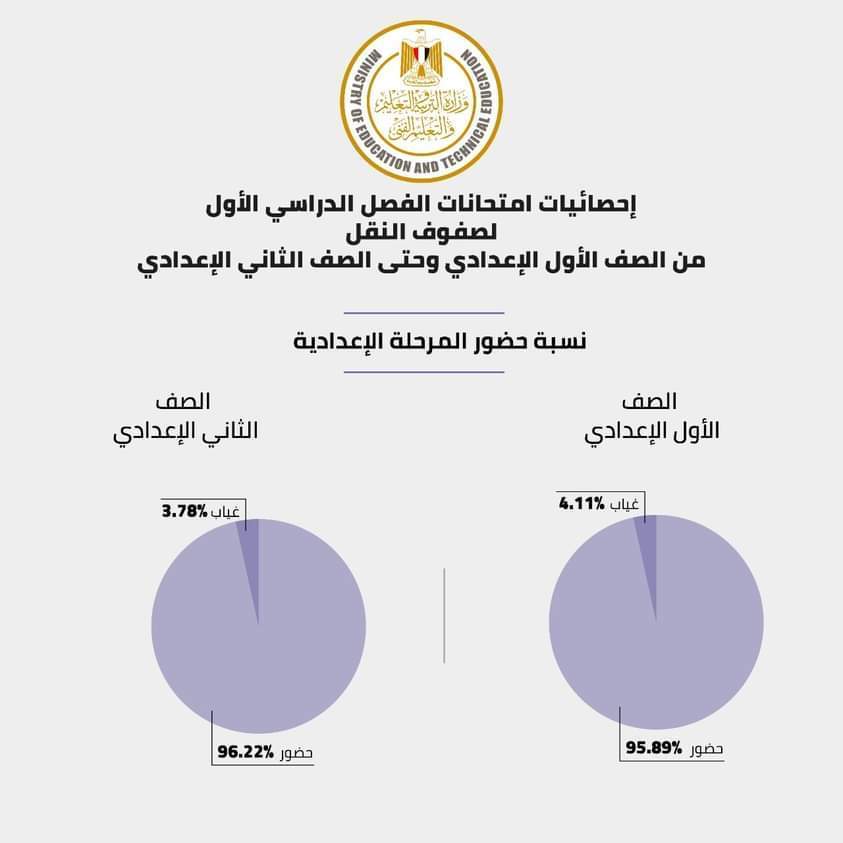 فيما جاءت نسبة الحضور بالمرحلة الإعدادية للصف الأول الإعدادي 95.89%، بينما جاءت نسبة حضور الصف الثاني الإعدادي 96.22%.