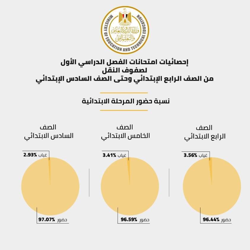 وجاءت نسبة حضور الصف الرابع الابتدائي 96.44%، ونسبة حضور الصف الخامس الابتدائي 96.59%، ونسبة حضور الصف السادس الابتدائي 97.07%