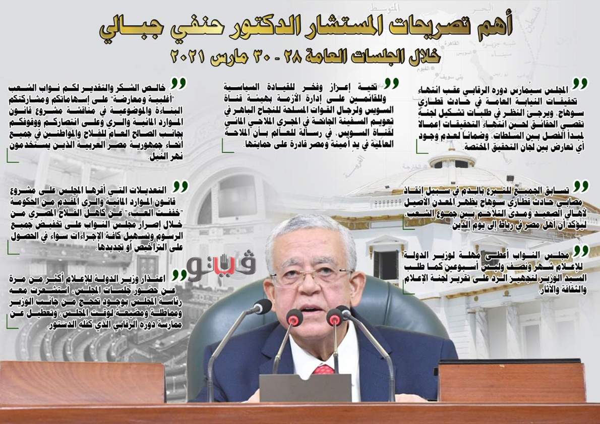 شهدت الجلسات العامة لمجلس النواب الأسبوع المنقضي إعلان رئيس المجلس المستشار الدكتور حنفي جبالي عن عدد من التصريحات والرسائل الهامة.. وجاءت كالتالي: