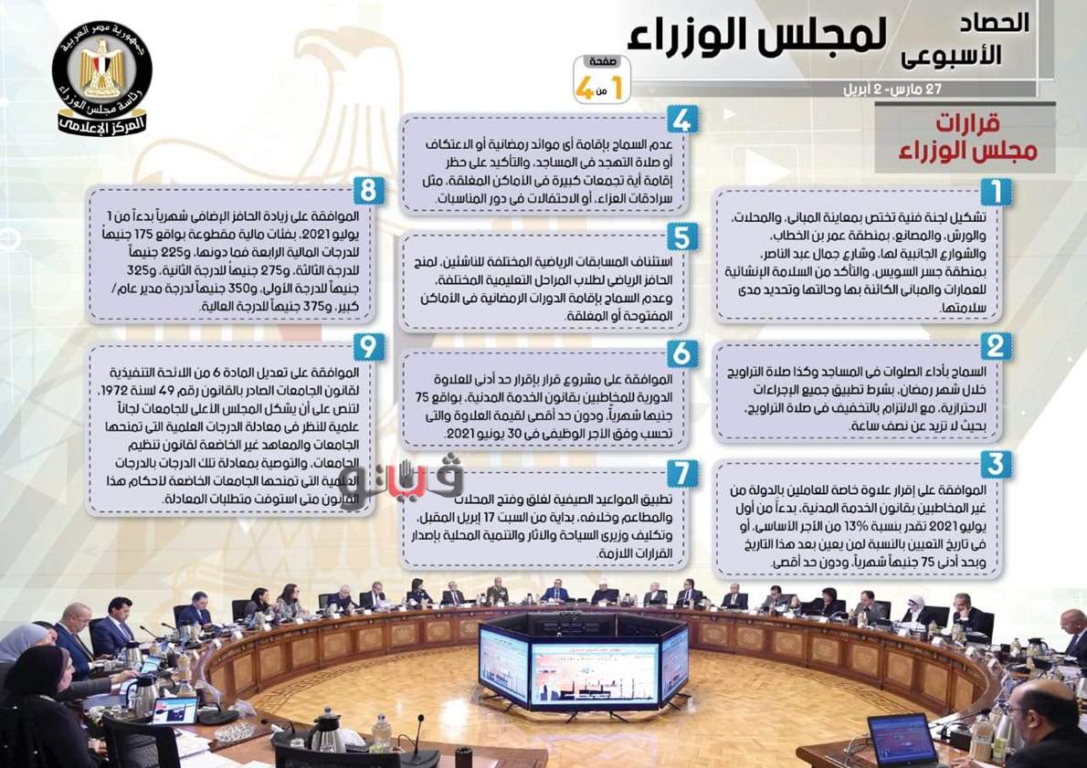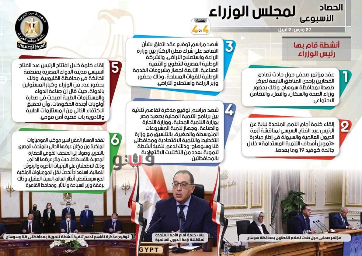 نشر المركز الإعلامي لمجلس الوزراء، تقريراً شمل إنفوجرافات سلط من خلالها الضوء على الحصاد الأسبوعي لمجلس الوزراء، وذلك خلال الفترة من 27 مارس حتى 2 أبريل 2021، والذي تضمن الموافقة على عدد من القرارات، فضلاً عن الاجتماعات التي عقدها الدكتور مصطفى مدبولي، رئيس مجلس الوزراء، بالإضافة إلى ما قام به من أنشطة.