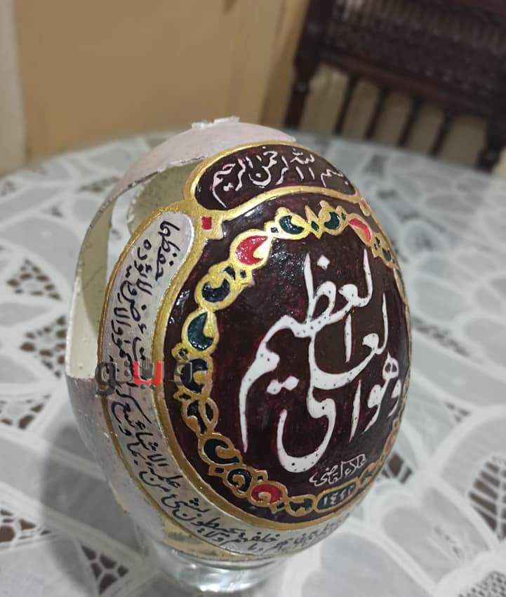 علاء القاضي أشهر فناني وخطاطي الصعيد بمحافظتي قنا والأقصر، يبدع في هذا الفن ويقدم أشكال فنية من بيض النعام.