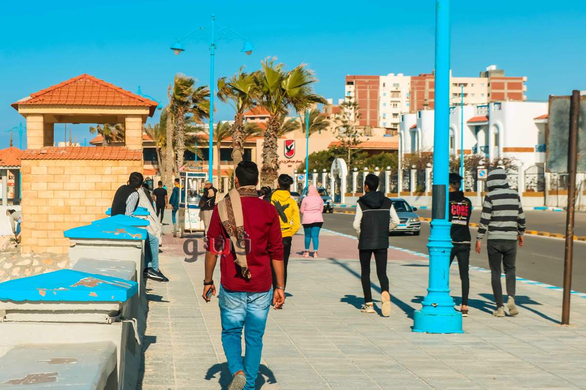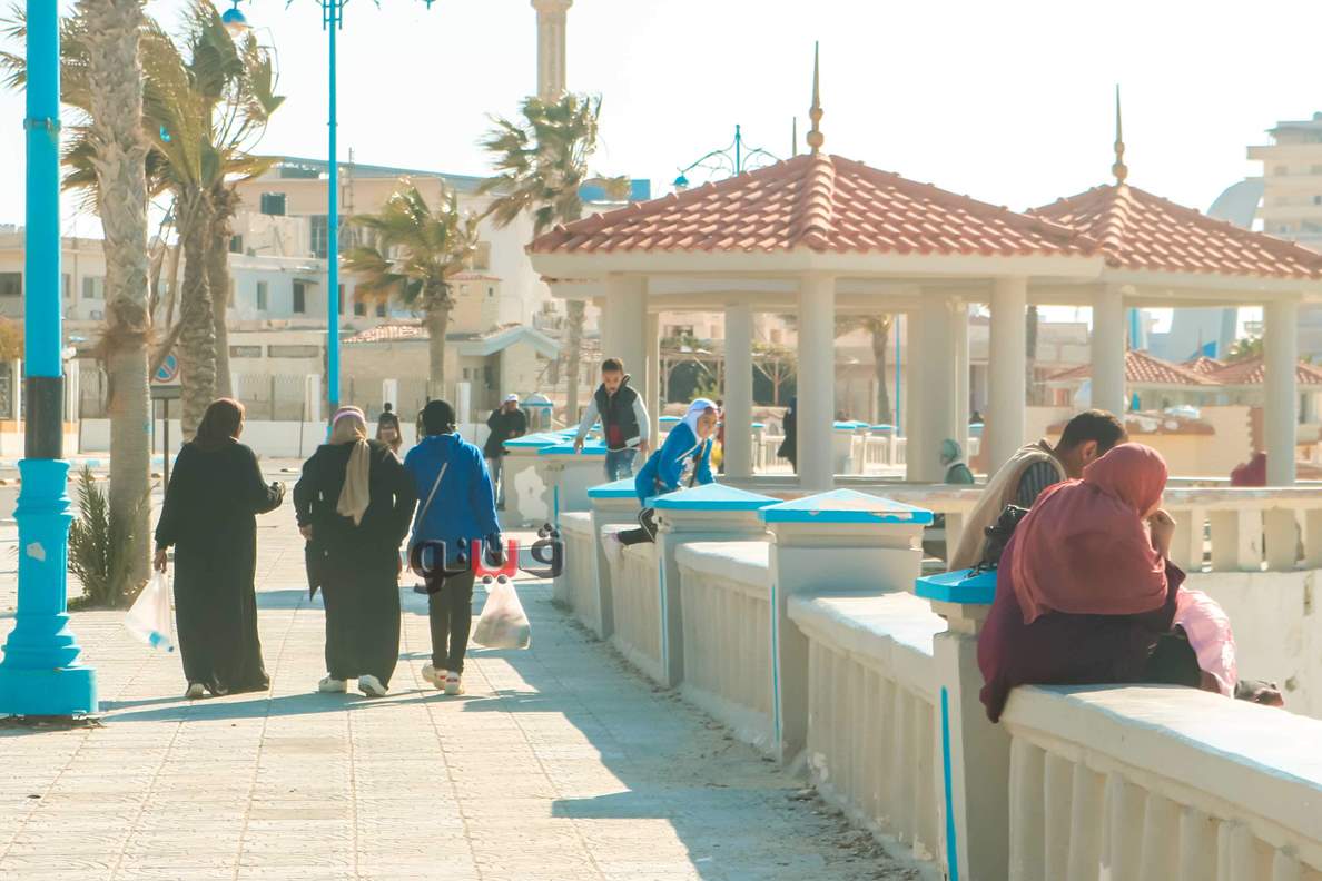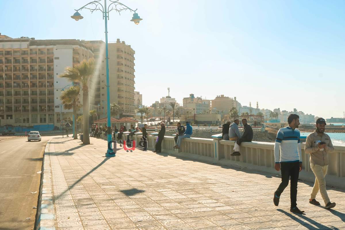 وافترش البعض من الأسر والعائلات والشباب الأراضي بكورنيش مرسى مطروح للاستمتاع بالطقس المستقر، وسط قيام البعض بتناول المأكولات المختلفة وآخرون للهو والتصوير والصيد.