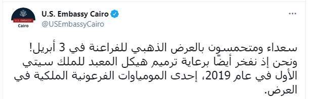 وكتبت السفارة الأمريكية تغريدة على تويتر "سعداء ومتحمسون بالعرض الذهبي للفراعنة في 3 أبريل! ونحن إذ نفخر أيضًا برعاية ترميم هيكل المعبد للملك سيتي الأول في عام 2019، إحدى المومياوات الفرعونية الملكية في العرض"