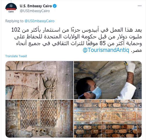 وقالت "يعد هذا العمل في أبيدوس جزءًا من استثمار بأكثر من 102 مليون دولار من قبل حكومة الولايات المتحدة للحفاظ على وحماية أكثر من 85 موقعًا للتراث الثقافي في جميع أنحاء مصر"