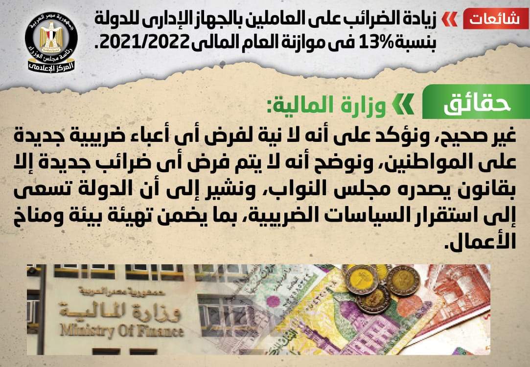 تداولت بعض المواقع الإلكترونية وصفحات التواصل الاجتماعي أنباء بشأن زيادة الضرائب على العاملين بالجهاز الإداري للدولة بنسبة 13% في موازنة العام المالي 2021/2022.