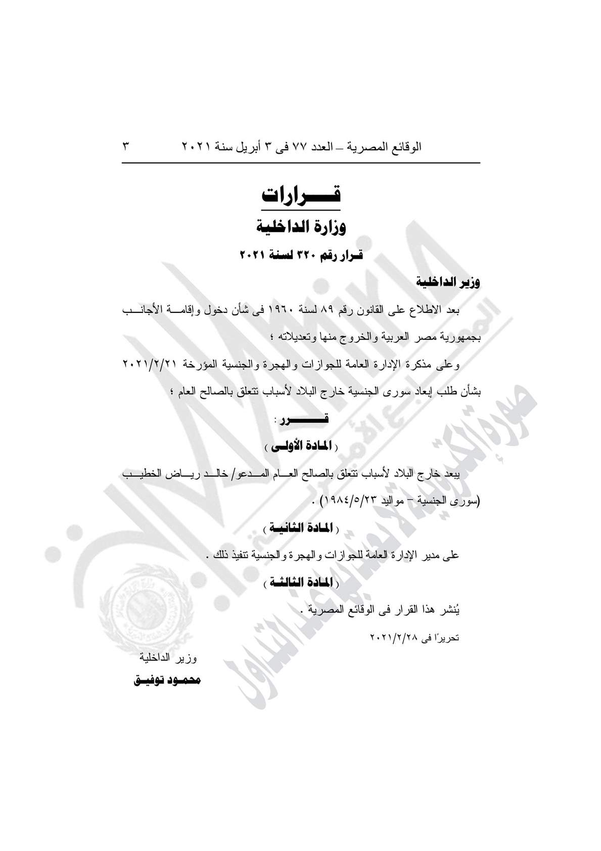 نشرت جريدة الوقائع المصرية في عددها رقم 77، الصادر في 3 إبريل 2021، قرار وزارة الداخلية رقم 320 لسنة 2021، بشأن إبعاد سوري خارج البلاد لأسباب تتعلق بالصالح العام.