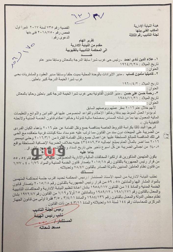 أكد تقرير الاتهام في القضية أن علاء نادي أحمد، رئيس حي غرب شبرا الخيمة وكاميليا مأمون كساب، مديرة العقود والمشتريات بالحي ورحمة حسن علي، مديرة الشئون القانونية خالفوا أحكام قانون الخدمة المدنية ولائحته التنفيذية ولم يؤدوا العمل المنوط بهم بدقة وخالفوا الأحكام والقواعد المنصوص عليها في القوانين واللوائح والتعليمات المالية المعمول بها بما من شأنه المساس بمصلحة مالية للدولة.